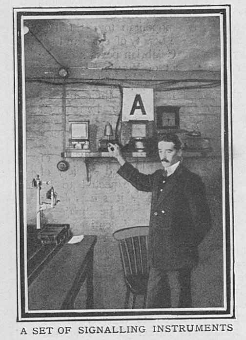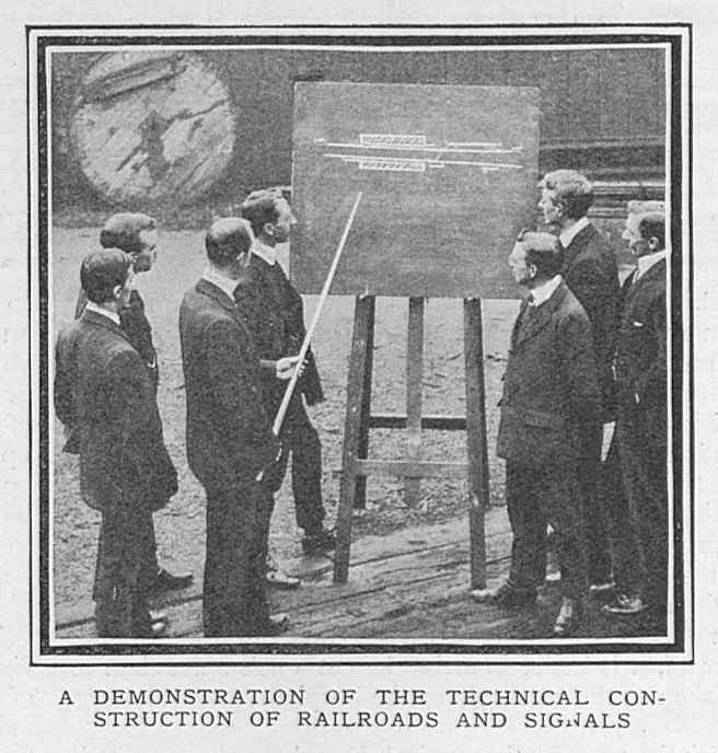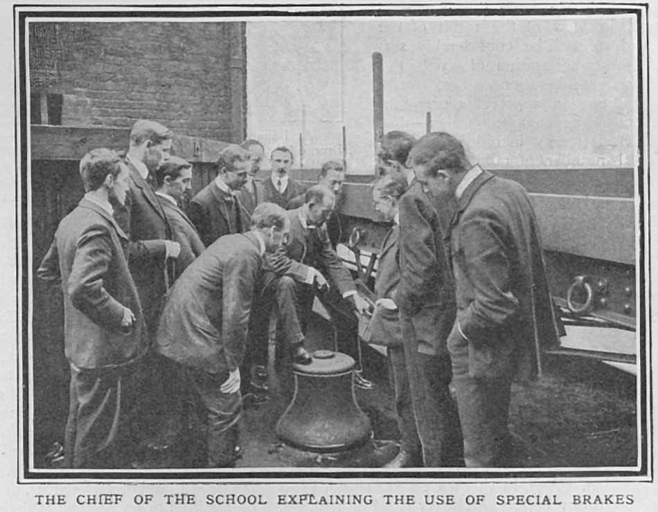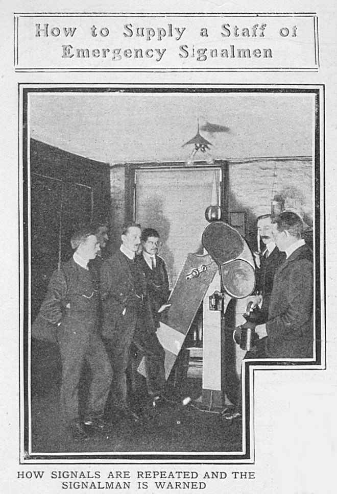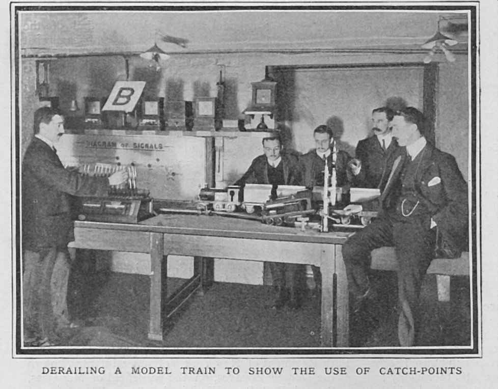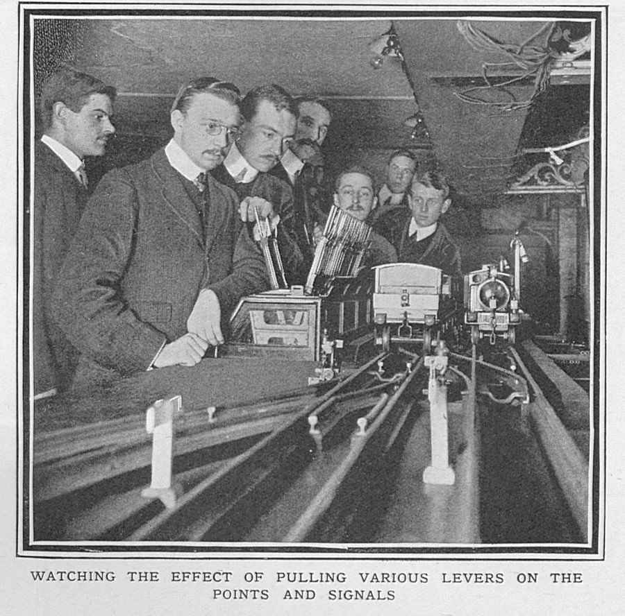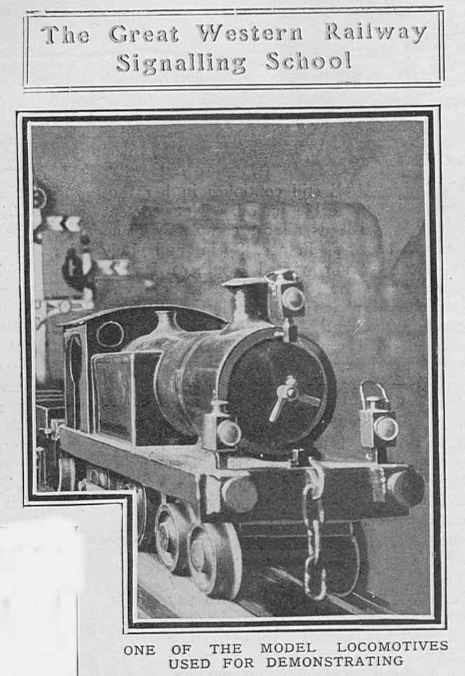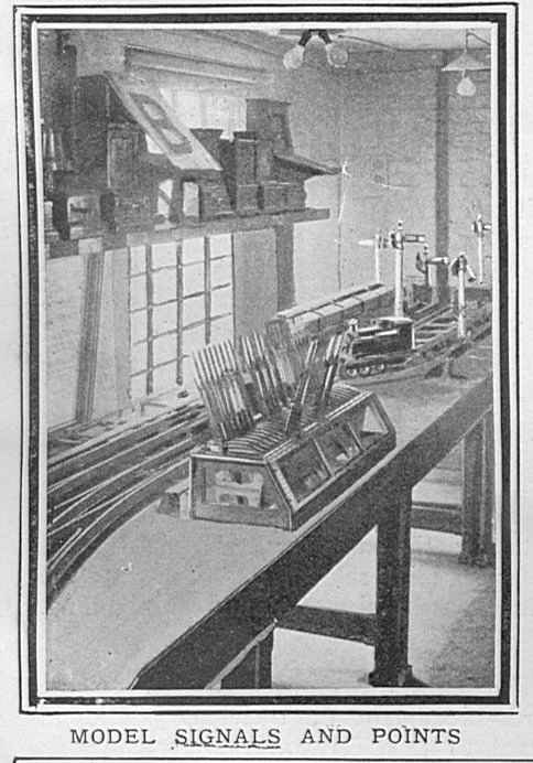 | SIGNALLING THE GWR SIGNAL SCHOOL, 1907 from The Graphic, 2nd November 1907 About four years ago the Directors of the Great Western Railway Company decided to organise a series of lectures on Signalling and the Safe Working of the Railway, and the instructors had placed at their disposal a number of sets of what are probably the most perfect models of the kind in existence. There is at present a chief school at Paddington, and similar schools exist in various towns on the system. The members of the clerical staff, for whom the schools were designed, have freely availed themselves of the opportunity thus given them. Certificates of efficiency are given after examinations, and these weigh with the officers in their decision in selecting men for promotion. At Paddington a staff of four instructors take turns in lecturing to the students, while Mr. A. E. Bowden, who has his offices at Paddington, is chief of the whole system of Signalling Schools. Every student leaves the school sufficiently proficient to undertake duties in a signal-box. There is no detail lacking in the model railway, which extends the whole length of a bench some thirty feet long. Several model engines with a proper equipment of passenger carriages, produce cars and trucks, are arranged to run on the line, while the signal levers are absolutely interlocked in the same way as those in a full-sized signal-cabin, making it impossible for conflicting signals to be lowered or conflicting movements to be made. Even the smallest detail is worked out to perfection in the models, students being taught to fit the proper head-lights and taillamps to their trains, and made thoroughly conversant with the uses of catch-points, which are arranged on our railway systems to derail any runaway vehicles and prevent them entering on to the main roads. By means of a full-sized model they are given the advantage of studying the electric signal repeaters, which inform a signalman in his cabin if a signal-arm fails to respond to the movement of the lever, the lamp repeater giving similar warning if the light at any time goes out. Photographs by Clarke and Hyde.