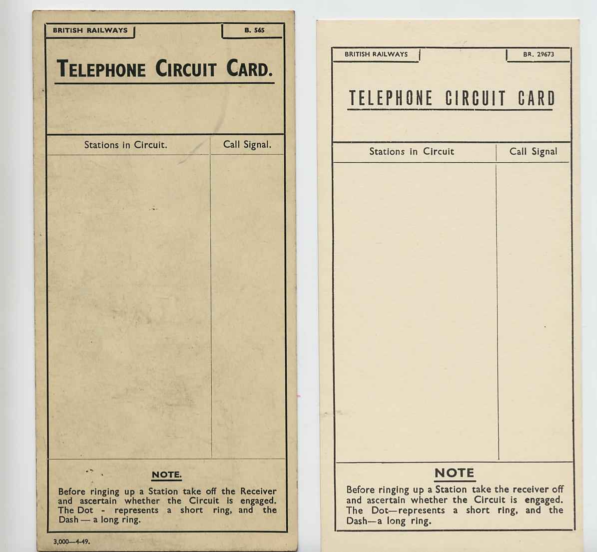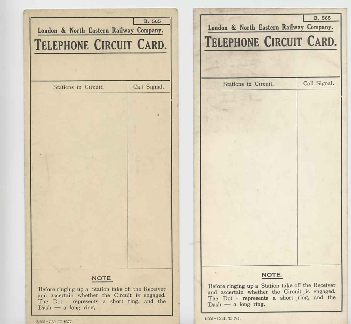 These rather narrow cards fitted the cast-iron frame favoured by the LNER. The left hand and right hand cards differ only in the date of printing. Versions exist with codes and calls pre-printed. Normally the codes were typed or hand-written.