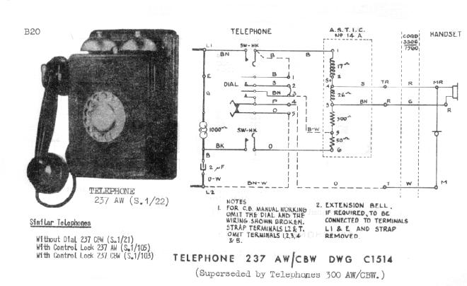 Telephone 237AW and Telephone 237CBW are handset types converted from a wooden CB bell box. The serial numbers are 1/22 and 1/21. Drawing C.l5l4 shows the wiring of both the CB and Automatic telephone and a copy is fixed inside the instrument. The CB instrument is not convertible to automatic and will be changed if the service is to become automatic. Experience has shown that the instruments in `convertible' form is not always warranted and many are never converted. In the present case, the plain front is being retained. This telephone has all the advantages in quality and volume of transmission and reception provided in the latest types of handset instruments. When stocks are available these instruments will be issued for all wall type handsets in CB and automatic areas. The use of table telephones mounted on brackets (162AT/CBT, 232AT/CBT and 332AT/CBT on brackets) will be discontinued as soon as possible. Click here for this instruction in PDF format Pictures