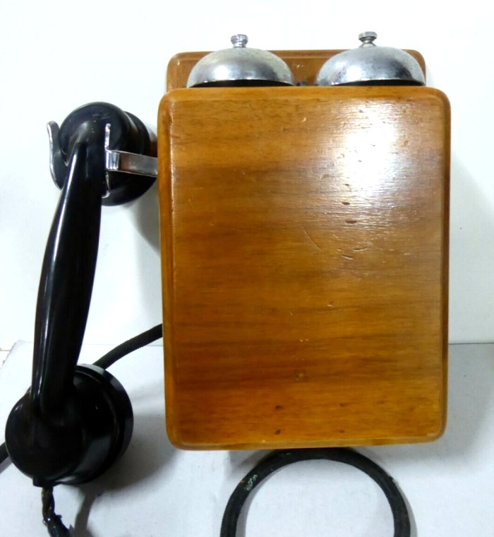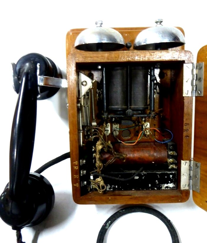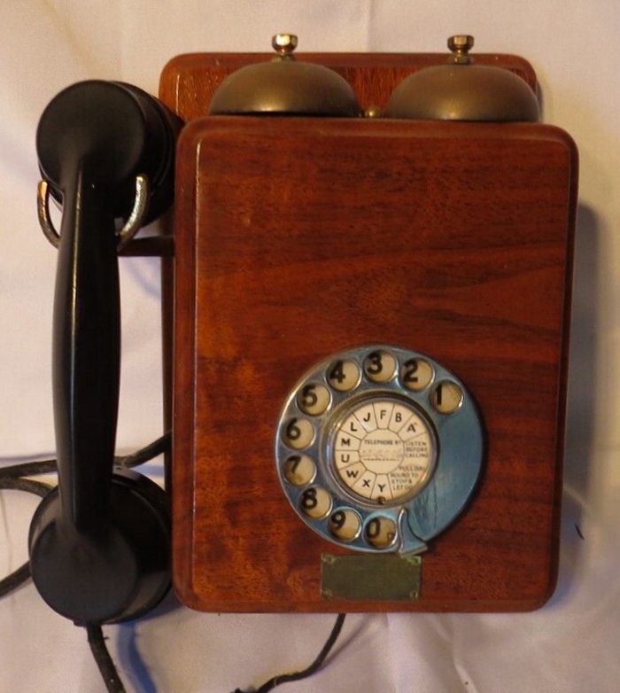 Telephone, Automatic, Wall Wooden wall telephone that was supplied as Automatic or Central Battery versions. Introduced around 1939, this telephone was introduced to use up the existing stock of Bellsets and became the standard wall telephone at that time. All telephones were refurbished. Models 237AW and 237CBW incorporated the new Bakelite handsets on a modified switch hook. Older phones were completely stripped, cleaned and refurbished, as they had to compete with the newer Bakelite models. Metalwork was replaced where necessary, the newer No. 10 dial was added and a new black rayon anti-twist cord was fitted. The PMG had a large stock of earlier Type 37's and bell boxes recovered from redundant candlestick phones and this was an economic way to use them. The refinished phones were very attractive in their wood grained maple, oak and walnut timbers. On converted Type 37's the dial hole was already in the lower part of the door so the transmitter holes were filled or plugged with small wooden plugs. The 37 series remained the standard auto wall phone until the early 1950s, at which point Bakelite phones took over.