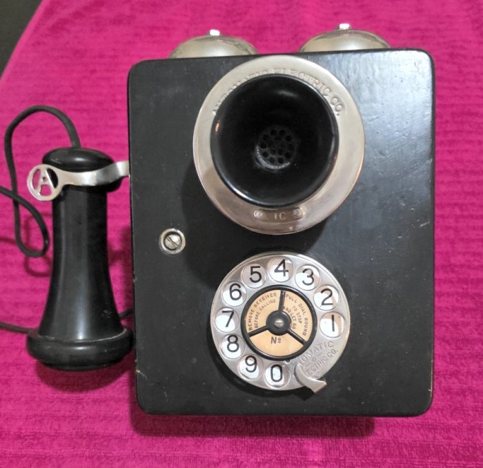 Telephone, Automatic, Wall (Geelong, Victoria) Black painted wooden cased wall telephone used on Australia's first automatic telephone exchange at Geelong, Victoria in 1912. This was Strowger Automatic telephone apparatus, manufactured by the Automatic Electric Company, Chicago, USA. This phone was also made by the Automatic Electric Company and known by many as the Geelong type.