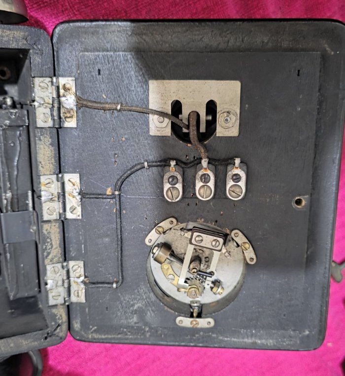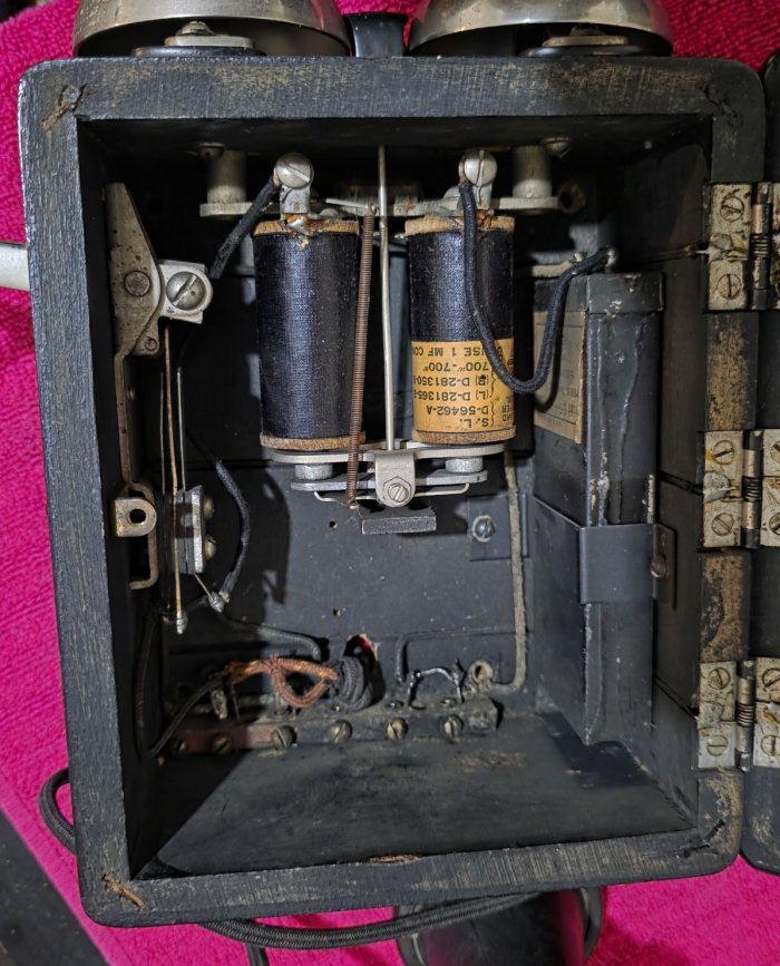 Note the "A" stamping in the end of the switch hook. This was seen on earlier phones. It did not, as is widely supposed, stand for "Australia", but for Automatic Electric. It is seen on early U.S. phones as well.