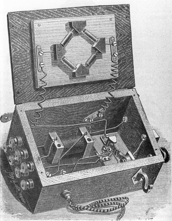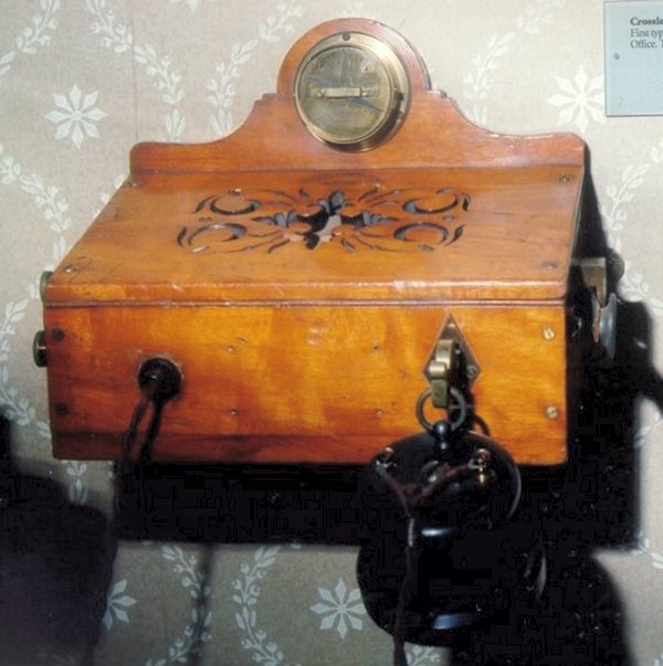 This is a Crossley design which was manufactured by Blakey and Emmott of Halifax in the UK. Made as a wall telephone, the transmitter diaphragm was mounted beneath the fretwork cover. This transmitter was of the pencil type. The rather dumpy Crossley receiver was hung on a spring loaded, switch hook, on the front of the case. A Galvanometer was sometimes fitted and this showed the line current which proved connectivity to the exchange. The lever switch on the right hand side of the case was pressed to call the exchange. These telephones were used on permanent current system exchanges. Click here for an explanation of how the phone worked Pictures