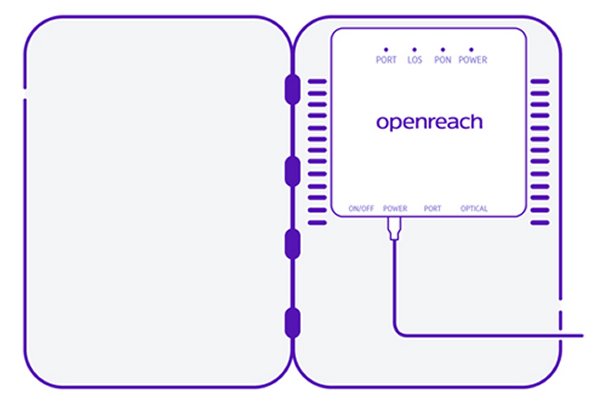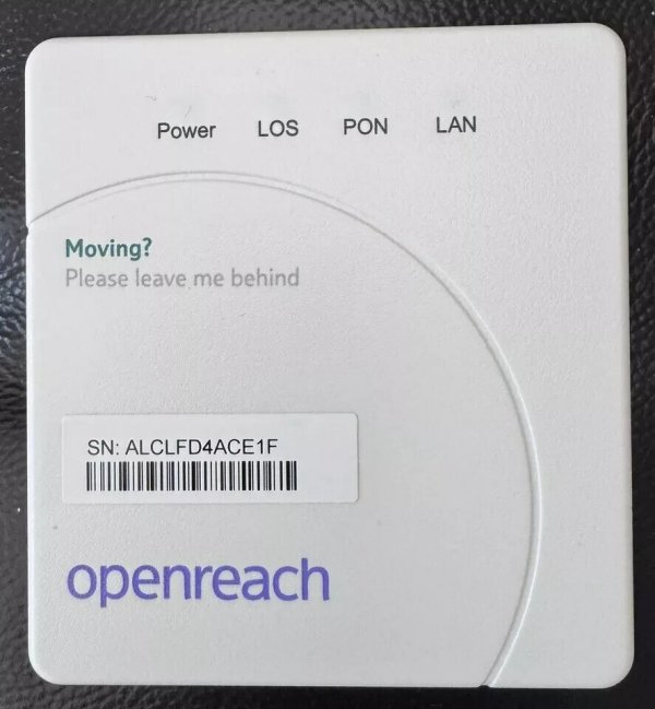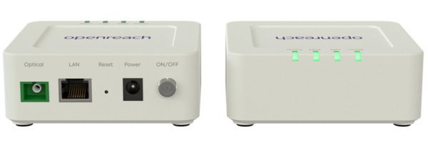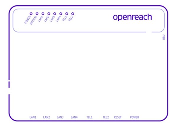 Modem or Optical Network Termination Device (ONT) There are now (as of 9/6/2025) ONT types used by Openreach. All these ONT's have lights on the front, click here for the meaning of these lights. Huawei 1-port The Huawei 1-port model is also powered by a white coloured power supply which is connected to the battery unit (BBU). The Smart Hub is connected to the ONT socket marked PORT 1 with the red plug needed cable. The other end of this cable is connected to the WAN port (Port 4) on the Smart Hub. To access this gain access firstly open the door at the bottom of the unit. This door is hinged on the left and opens by pulling the tab on the right hand side. The top cover is fixed by a single Philips screw which will now be visible. It is to the right and just under the top door - you can see the screw hole in the picture. With the screw removed the cover will require a good pull to open. The ONT box houses two units. Left is the fibre termination unit and to the right is a battery pack. The fibre terminating unit has 5 LED's and the battery pack has 3 LED's. Normally no action is required with this box but sometimes a red fault light shows even though the phone and internet are working. This normally happens after a power failure. Inside the battery pack are a couple of batteries. These batteries will be at a low voltage after a power outage and will start recharging. As they charge the red light will extinguish and the charging light will go yellow and then go out when they are fully charged. If the red fault light persists after 24 hours and then the batteries will require replacing. This is the customers responsibility according to BT. The green optical cable would have been connected by your engineer. Do not unplug it. If the PON light is off and the LOS light is red or flashing, check that the cable's inserted fully into the modem. Contact BT if you're still having issues and:-