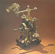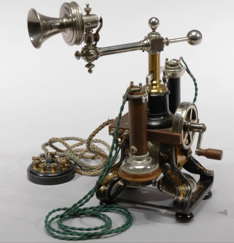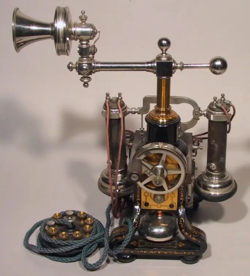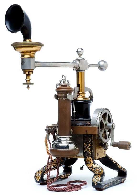 Designed by Lars Magnus Ericsson this telephone started production in 1885 and was the forerunner to the skeletal telephone 375. The adjustable swivel arm (swing arm) allowed the user to position the telephone's transmitter in a convenient position for conversing. The telephone was used by the Australian N.S.W. State Administration in the 1880's and not many are known to exist in Australia. However, a few still survive in the United States and the United Kingdom, most in private collections. The primary difference between the two telephones, is that the skeletal (c.1892) employs a handset, whereas the swing arm uses separate components for the transmitter and receiver. The telephone shown to the right has two receivers.