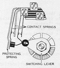 in Fig. 6 pictured to the right. When the finger plate is moved from its normal position the switching lever moves away from the set in the contact spring and the two pairs of contacts 'make'. On the return of the finger plate to the normal position the switching lever again engages with the contact spring and the contacts 'break'. Thus the contact springs only make when the finger plate is