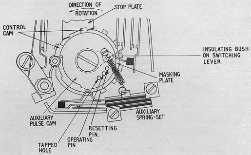cam and lift the lever spring up the cam step. When pulsing is completed the switching lever bush strikes the resetting pin and resets the cam and auxiliary spring contacts as the finger plate completes its movement.