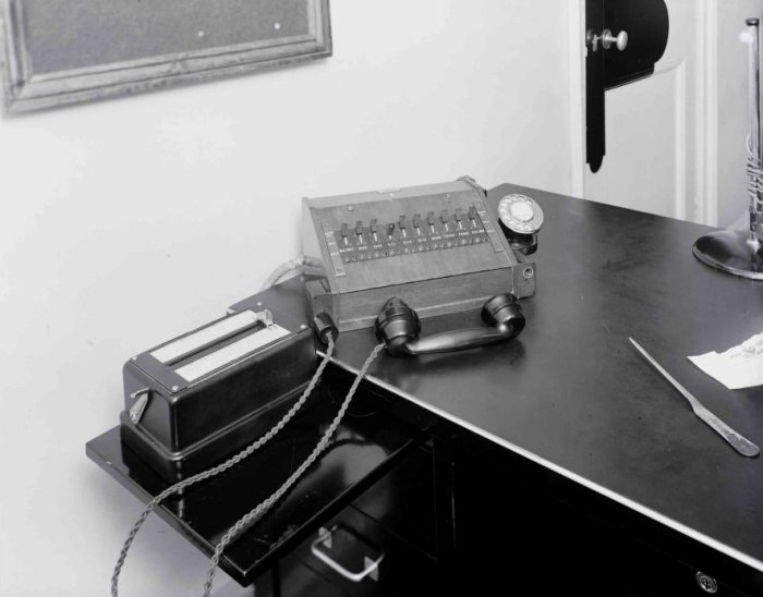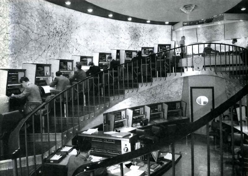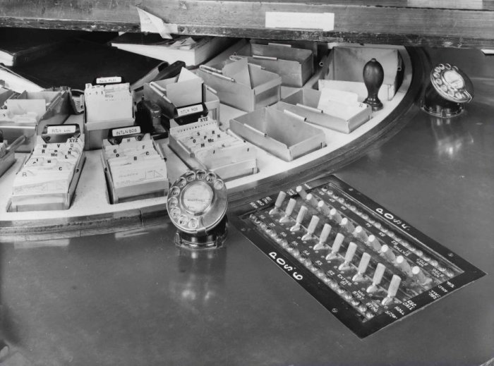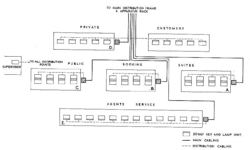 bookings from the public are received, is shown in Fig. 7; the subdistribution point is in the wooden housing on the near end of the table.