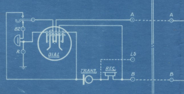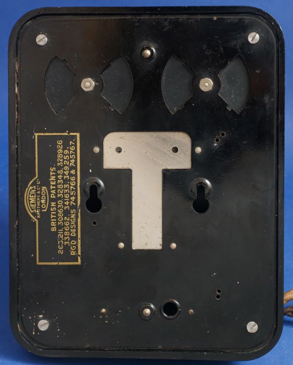 Siemens Brothers Neophone No. 101A wall type Bakelite telephone fitted with a dial but without bell ringer or buzzer. A Bellset or Bell would have been mounted externally. This telephone was made for the Relay Automatic Telephone Company (R.A.T. or RAT Co.) and would have been used on their smaller PAX systems with DC ringing. The front cover is fitted to the Bellset cover which has the base plate fixed to it. There is also a wall bracket which is shown fitted to the base plate. The hook switch is different to the standard Neophone as it consists of a make and a changeover contact set, with only the changeover contact in use. The Bellset consisted of just a terminal block. There were no bells or ringer and the sound holes are blanked off. The circuit diagram shows a transformer but no induction coil. The diagram also shows an external DC buzzer connected to the 'A' leg of the line and is disconnected when the handset is lifted.