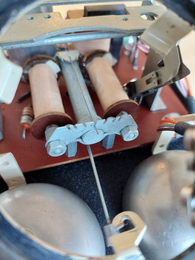 600 Models The base had holes punched out to allow the sound of the bells to be heard. These holes were covered by a thin layer of plastic which is assumed to stop insects entering the telephone. The bell gongs are inverted and the bell ring has a cranked swinging arm. There is also a wire adjuster on the bell ringer probably acting as a bias spring. Only four wires connected the dial and terminals 2 & 3 on the dial were linked together.