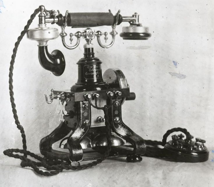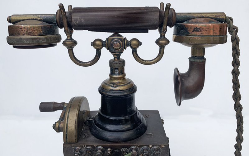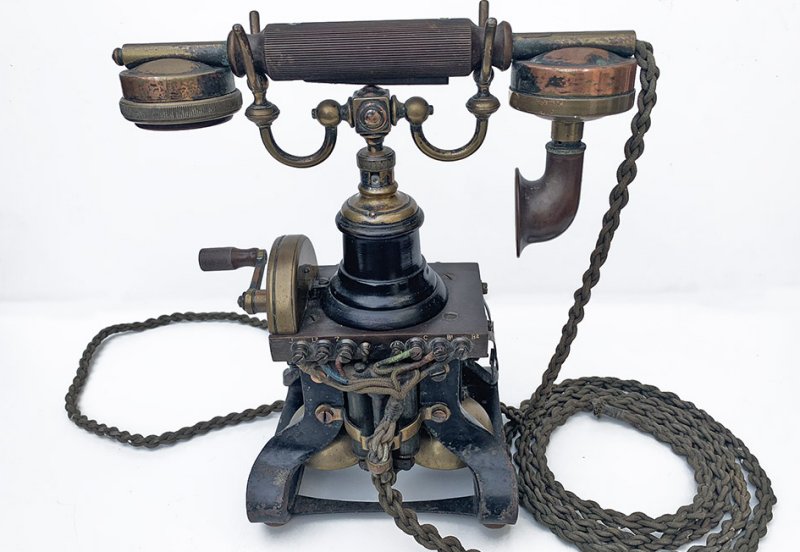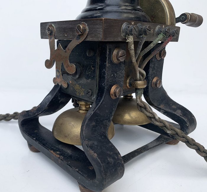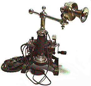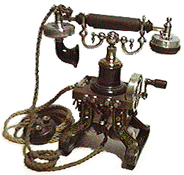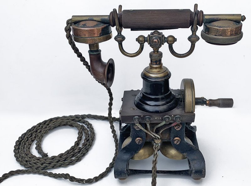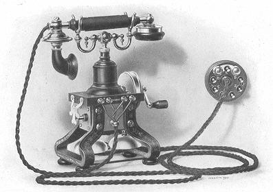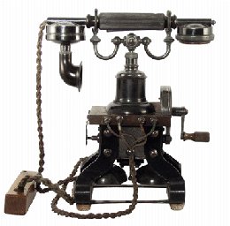 Telephone This was the world's first telephone with a one-piece handset, and probably more familiarly known as 'The Skeleton telephone', or, to the British collector as the 'No.16'. Almost all of the early prototypes are now housed in Museums. The handset model was dubbed the 'Ericsson Royal', as it was supplied initially to most of the Crowned Heads of Europe, and the National Telephone Company in England installed one in Windsor Castle at the command of Queen Victoria. The 'Mk.2' model for local installation in Sweden varied according to the system to which they were fitted, some having a lightening arrestor on the plinth instead of in the connection rosette; a smaller bell motor, and in some cases, smaller twin bell-gongs. By 1902, a 5th terminal had been added, and a twin-crank magneto fitted. A button was fitted on some models to open-circuit the ringer coils and short out the secondary winding of the inductor. The 6th edition of the catalogue (1911) was the last to show the swinging arm model. Almost from its first appearance, it was a worldwide success, and was later produced, under licence, in many countries, including the USA, South America, Great Britain and Europe. After 1911, the design remained basically unaltered throughout its long production run, except where minor modifications were made to accommodate local requirements. When the National Telephone Company relinquished its role and assets in 1912, the GPO designated the 'Skeleton' or 'Royal' as their 'Telephone No.16', being extremely conservative, and frowning upon unconventional names for their equipment. Records suggest that production ceased, at least in Europe, in the early 1930's, but many remained in service there until the late 1960's, and in Australia until ten years later. Some in the UK were fitted with dials during WW2, due to shortages of the GPO's 200/300 types. Most were black, but some, made in South America, or reconditioned in Sweden and Denmark to order, were enamelled in bright colours with silver or gold filigree. These are now rare. When the 'Skeleton' telephone first began to attract collectors in the USA in the mid-1950's, a black model in reasonable condition could be bought for $5. By the late 1960's, the price (USA) for a Portuguese manufactured model had risen to $40. Now, one in similar condition stocked by a dealer in the UK could cost between £400 and £800. Restoration of damaged specimens can be undertaken, with diligence, and some spares are still available via Collector's Clubs and Antique Telephone dealers The Ericsson 'Skeleton' or