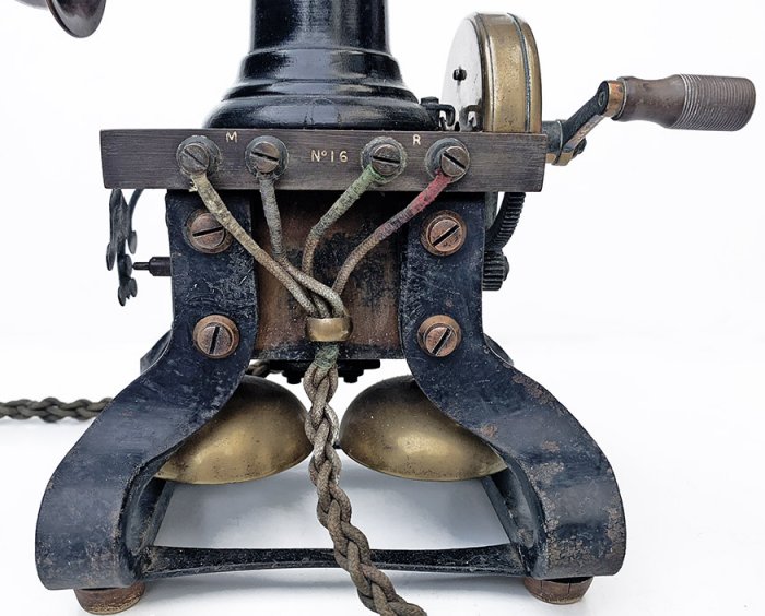 Magneto Table Telephone This is a self contained Magneto table telephone which was nicknamed the 'Skeleton Telephone'. It was the L. M. Ericsson Model No. 375 which was first produced in 1890. The National Telephone Company (NTC) purchased the (No. 375) and Ericsson supplied 100,000 of these telephones to the NTC, in 1889, for use in Britain. When the GPO bought out the NTC, many of these telephones were inherited and the GPO originally called the NTC telephones the "Instrument, Subscribers, Table, N.T. No. 2". The telephones however, were called "Telephone, Table with Generator B" and then later both of them were renamed the Telephone No. 16. This telephone was used on Magneto and CBS exchanges. The transmitter was powered by local batteries housed in a separate battery box. The battery was called a "Battery, Leclanche, Agglomerate, 6 block, 2 cell". If a second receiver was required then a "Hook, Receiver C" and a