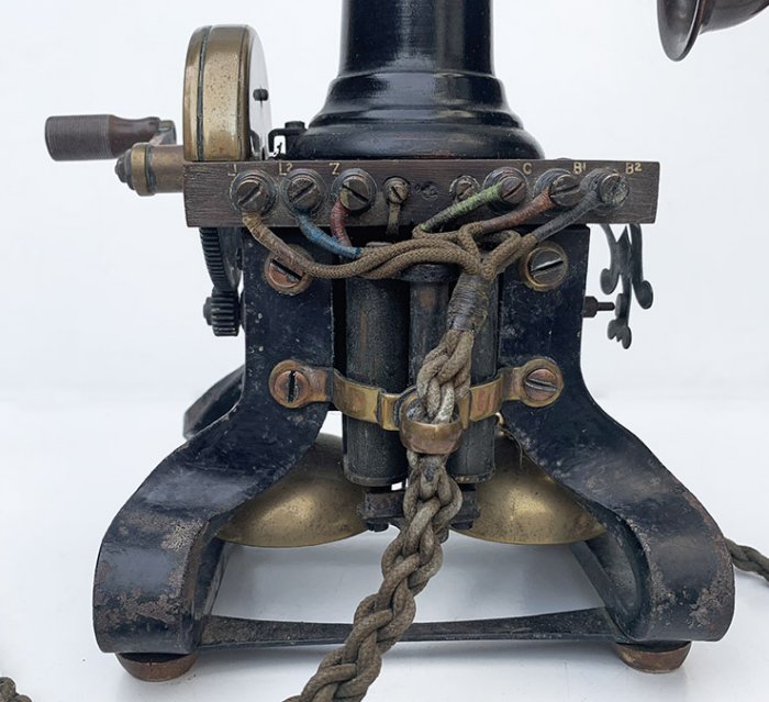 This is an early form of table set and it is perhaps the prettiest magneto telephone which has ever been designed. It is entirely self, contained, except for the local battery, which is accommodated in a battery box. The permanent magnets of the generator form the support upon which the instrument rests, and the magneto bell is fitted between the legs. The induction coil is placed above the magneto generator and the micro-telephone is carried on a cradle which actuates the gravity switch. The instrument is connected to the internal wiring by means of a flexible cord terminating in a Rosette or a connection strip called a Strip, Flexible Cord Connection. Click here for more information. Exchange number label is a Label No. 65.