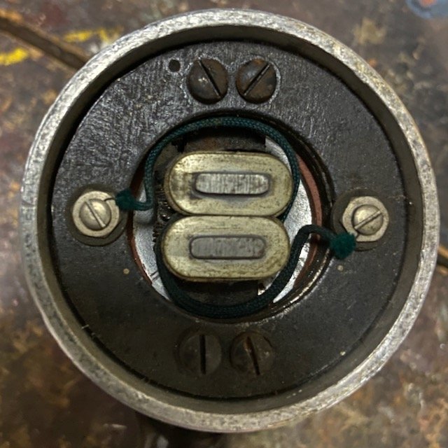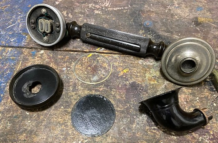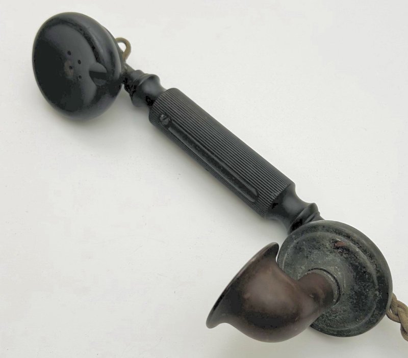 A Local Battery handset with battery cut off switch fitted in the handle. Being local battery it requires a battery power source at the telephone. The handle is made of Ebonite with an integral switch. The switch connects the telephones local battery into circuit, which then powers the transmitter. Originally called the "Telephone, Micro" by the GPO. The NTC "Micro Telephone, Hand, N.T. No. 5" was also renamed as the Telephone No. 28. These types were superseded by the Telephone No. 86 in 1916. This handset was used on many early telephones and could be fitted with a loop or hook suspension eye. In these cases the handset was called the "Telephone, Micro, with loop suspension or the Telephone, Micro" with hook suspension" and a "Contact Hook" or "Suspender for Micro Telephones" would be fitted. Hooks were discontinued in 1915 and only loop types were available. Fitted with a Cord No. 403 (4 way), which was substituted with the Cord No. 421 in 1916. See also:-