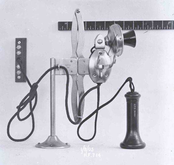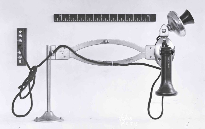 C.B. telephone that consists of a fixed transmitter a bell receiver and switch hook, all mounted on an adjustable arm. These were originally NTC telephones called the "Adjustaphone C.B." and renamed by the GPO as the "Instruments, Subscribers, Table, N.T. No. 18" and then renamed around 1912 as the Telephone No. 64. The adjustable arm was called a Brackets, Telephone No. 3 which could be fitted with two types of adaptors. This telephone has no active transmission components and because of this a Bellset No. 1 is required. The metal casing was used as part of the electrical circuit. They were manufactured by Western Electric. The NTC tested the WE Adjustaphone, in 1906, and concluded that the receivers were acceptable, but could not recommend the transmitters as these were inferior to the standard transmitters. It is probable that these were then fitted with Solid Back Transmitters. In 1916 it was advised that there was no superseding item available. Found in the 1906, 1910, 1911, 1912, 1913. 1914 and 1915 Rate Books but not in the 1928 Rate Book. Telephone Includes (1906, 1911, 1912, 1913 and 1914):- Brackets, Telephone No's 3, 4 or 5 to be requisitioned seperatly. Introduced circa 1900. Circuit diagram - N164 (Dated 1917). Pictures dated 1905