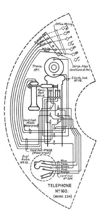 Originally fitted with a Transmitter No. 1 and a Dial, Automatic No. 10. Fitted with a switch hooks comprise of two sets of springs. One set being a change over and the other a set of three springs that all make together. Early table telephones were connected to the internal wiring with a Strip, Flexible Cord Connection. Click here for more information. Circuit Diagram - N1281 - For 2-party line, automatic circuits. Used with Bellset No. 22 or 32, for X and Y stations. Telephone includes (1946):- To be requisitioned as required:- Circuit Diagram - N260. Paster Diagram - Click here. Drawing - 8983 (dated 1928). Specification - D713. Click here for pictures of a Candlestick before refurbishment Click here for Candlestick construction and how to dismantle the phone Candlestick Manufacturing (Messrs Keitmann) How to convert to Plug and Socket Collectors Information - what to look for Telephone mouthpiece sanitisers Terminal Markings