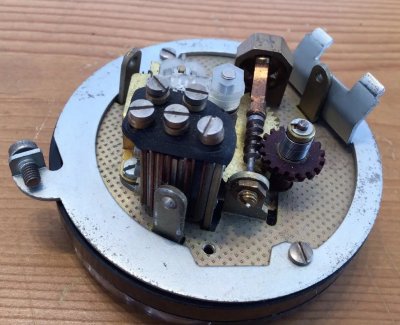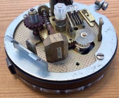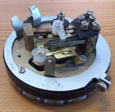 (Page 63) Moulded components are used whenever possible, for example, the moulded base, the combined number ring and finger-plate and the combined nylon pinion and cam for operating the impulse springs. The moulded base is screwed to a circular steel base, which carries the whole of the mechanism. A steel bearing plate provides one bearing of the main spindle which at this point is fitted with an oil-impregnated phosphor bronze liner. A brass bracket, secured to the base by two screws, provides the other bearing for the main spindle. A feature of particular interest is that two brass gear wheels are employed, having a separating washer between and linked together by a tensioned "C"-shaped piano wire spring. One of the wheels is securely fixed to the main spindle and the other is free. A pinion plate, having a stub axle for the combined nylon pinion and cam, is also free 'on the main spindle. When, therefore, the pinion is engaged with the gear wheels and the finger-plate is turned, the pinion plate and pinion are carried round until arrested by a "stop". Further turning of the finger-plate thus causes the pinion and cam to rotate, but this has no effect as the cam is by now out of alignment with the impulsing springs. The cam plate moves backwards during the initial portion of return movement of the finger-plate and is then arrested by the stop, thus causing the pinion and cam to rotate and operate the impulsing springs during the remaining movement. The time taken from the commencement of the return of the finger-plate until the cam plate reaches its stop is calculated to give the required two-pulse delay period before impulsing commences. This action is extremely simple and reliable and, by virtue of the tensioned "C" spring between the two gear wheels, is entirely free from any backlash. The governor worm and wing assembly are of conventional design, the governor weights being of brass. The governor cup is of oil-impregnated phosphor bronze, and thus eliminates the need for lubricating the governor worm bearing. The thrust end bearing is of the captive ball type which has been well proved in service over many years. The governor is driven by a Bakelite worm wheel which forms part of a spring clutch assembly, which enables the clutch pinion to rotate without operating the governor weights during the winding up action. The Type No. 5 is practically noiseless in operation and has given very satisfactory results on life tests, over 3,000,000 operations having been obtained.