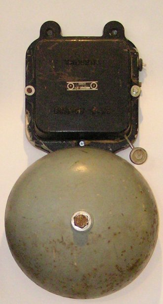 Bell No. 19A - A 12 inch (Gong-Bell No. 16) trembler bell used indoor and outdoor. Requires 8 cells Leclanche WK1 for operation. Bell No. 19B - An electric horn. This is worked from a battery of 5 small secondary cells which are charged from the mains electric supply. When these bells are installed they operate via an Indicator No. 3501AN, which replaces any existing remote bell. The Indicator No. 3501AN consists of a drop flap indicator, with an associated contact, that operates the bells. Bell No. 19A is shown pictured to the right. |