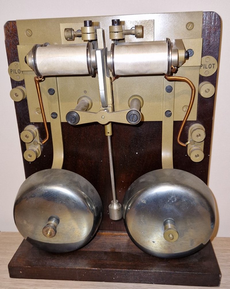 A bell of 1ohm resistance. It operates with a D.C. voltage with the polarity reversed 7 time per second (3.5hz). Uses two Bell-gong No. 8. The components are mounted on a mahogany stand and terminals are of the thumbscrew type. The stand is 12" high by 10" across by 4½" deep. The bell mechanism has four, 0.25 ohm, windings in series giving a total resistance of 1 ohm for the four coils. Used in the UK House of Commons as a Division bell in conjunction with a Transmitter, Division Bell (Drawing No. 1378). As from 1913, bells used external to the Parliamentary estate were standard A.C. bells working at 25hz. This bell produced a sedate, lazy, ring unlike normal telephone bells and were fitted in ornate wooden enclosures. Probably introduced around 1904. Drawing - 90013. Specification - S3A. Click here for a description of the UK Division Bell system Click here for the difference between a Bell and a Bellset