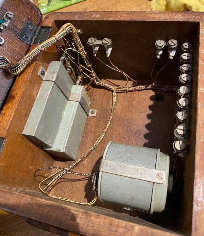 Connecting to the UK telephone system Click here for the difference between a Bell and a Bellset Additional Information This BPO wooden bell set was originally introduced to replace Bell Set No. 4 on Plan No's 5, 5A, 7 and 7A installations connected to automatic exchanges. The Bellset is shown to the right and the picture is dated 1932. As it was found to give better transmission conditions than Bell Set No. 4, its use was extended to Central Battery manual circuits. The Bell Set consists of a 4-position switch, an indicator-relay (Relay 257A of 50 ohms resistance), a Generator No. 4C, a Bell No. 1A, a 2uF condenser, and a 1uF condenser. A two-cell battery is provided to furnish speaking current on main to extension calls. The connections of the telephones resulting in the four positions of the switch are similar to those of the Bell Set No. 4. The internal connections of the Bell Set No. 20 are shown in diagram N520. It will be seen that the indicator relay is shunted by a 2uF condenser instead of by a non-inductive resistance as in the Bell Set No. 4. Also the magneto bell of the main telephone is disconnected by the contact of the indicator relay when the switch is in the through position. By these means, a circuit clear of any bridged apparatus is provided, with the result that, under automatic conditions, there is no distortion of the dialled impulses on account of the introduction of the bell set. The generator used at the extension instrument is connected in series with a 2 uF condenser, this combination being known as Generator No. 4CP. The necessity for the condenser arises from the fact that should the generator handle be turned when the switch is in the through position, the indicator relay would be operated by the current flowing round the loop provided by the armature of the generator when brought into circuit by the operation of the cut-out spring, whereas it is necessary that this relay should be released in order to connect the magneto bell at the main for the reception of the ring. The indicator-relay is of the pendant armature type, and is provided with a copper sleeve on the core. The armature actuates a single change-over spring set and an indicator attachment, consisting of a balanced aluminium lever which moves an aluminium flag into position behind a rectangular window. The indicator relay was designed by Messrs. Siemens Brothers to meet the following conditions:-