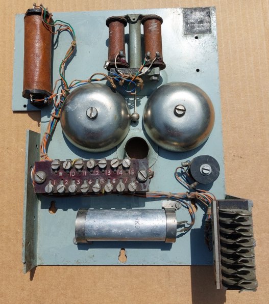 Click here for Pre-payments Coin Boxes The picture below shows were the parts are located. The Induction Coil is upper left, the Capacitor is lower centre, the 200 ohm Resistor is just below the right hand bell gong, the bell ringer is centre top (above the two gongs) and the connector jack is lower right.