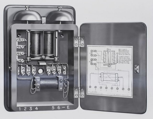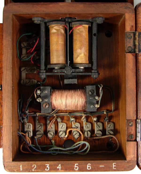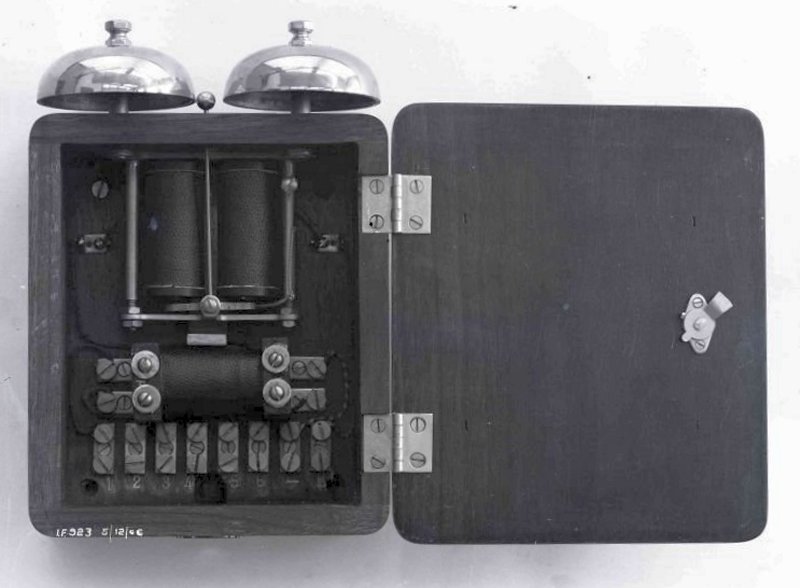 Fitted with a magneto bell ringer which has two 500ohm coils. There are links (shown as "A" on the diagram) to the left of the bell that can be configured to make the ringer resistance 1000ohms or 250ohms. This Bellset, however, has the bell coils wired in parallel, so as to offer a resistance of 250ohms when supplied. The Bell ringer is also ready to accept a bias spring. Click here for more information on Bias Springs. The wooden housing is called a Case No. 1 and could be constructed of American Walnut, Black Chuglam, Pyinma, Halou, Tasmanian Myrtle or African Mahogany. Introduced circa 1913. There were three revisions to this Bellset: Mark 234, Mark 235 and Mark 236. The Mark 234 was fitted with a Coil, Induction No.1, whilst the Mark 236 had a Coil, Induction No. 12. Superseded by the Bellset No. 31 in 1946 for new work, except when used with Telephone No. 1/194. This Bellset superseded the Bellset, Magneto, P.B. Bellset includes (1928):- Diagram - N505. Drawing - Bellset - 1576 (Mark 236 - Dated 1913). Click here for the difference between a Bell and a