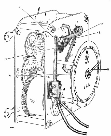 The movement consists of two spring-driven time trains. The first is a lever and escapement-controlled train, driving the single hand H. The second, which has no escapement, drives cam D which operates contacts C.