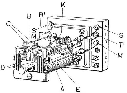 Relay, Type 90A (cover removed) It consists of an electromagnet B, having two 600 ohm