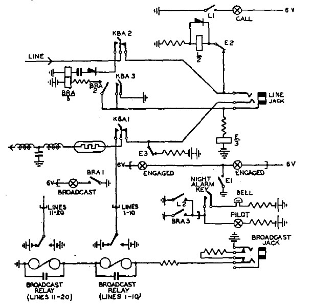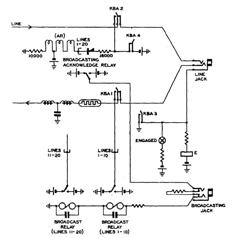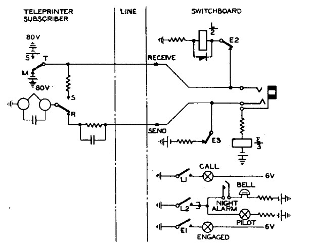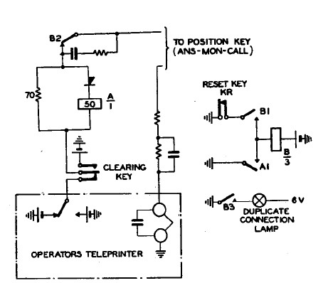 The lines terminate on the switchboard line jacks with an associated calling relay, but in addition a clearing relay is connected permanently to each line. The connection of a line to its jack appearance is via the contacts of a "Print and Monitor" key and a "Broadcast" key. The position teleprinter is connected through a switchboard jack to contacts of the "Print and Monitor" keys of lines 1 to 10 in series. To answer a call, the "Print and Monitor" key of the calling line is operated to "Print" and this connects the operator's teleprinter in simplex communication with the caller. Details of the required connection are received and the call is completed by patching a double-ended cord from the line jack of the calling line to that of the required party. The operator transmits "K" to the caller and then restores the print key in readiness for the next call. To monitor an established connection the "Print and Monitor" key of either of the connected lines is operated to "Monitor," and this connects a telegraph relay in leak from the send and receive lines and the relay repeats signals passing to the operator's teleprinter. To set up a broadcast, the calling subscriber is answered in the manner already described, the operator then operates the broadcast key for each line required and finally makes a patch using a double-ended cord from the calling line jack to the broadcast jack. The operator then signals "K" and restores the print and monitor key. Clearing signals from the lines after completion of intercommunication or 'broadcast calls are obtained by each subscriber operating the clearing key in the normal manner - this lights a clear lamp associated with each line jack. The facility is provided to enable the operator to broadcast by making a