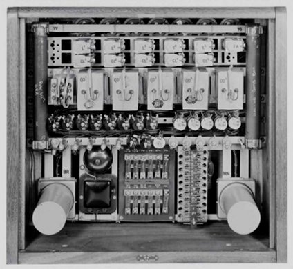 FIG. 1 - THE UMSCHALTER SWITCH This method of switching was adopted in England about the year 1854 by the Electric & International Telegraph Co., the switches being fitted at selected centres including London, Leeds, Manchester and York. Switching was chiefly confined to local lines connected to the particular centre. On occasions local lines were switched to main lines, but generally main lines were never connected together. The use of switching for Morse circuits was abandoned when the Government took over the British telegraphs in 1870. Of the private telegraph companies taken over by the Post Office, several had developed private wire services to renter's offices. One of these, the Universal Private Telegraph Co., had its largest installation at Newcastle-on-Tyne, comprising some thirty-five lines and instruments, the type of instrument employed being the Wheatstone A.B.C. which required no particular skill to operate. About 1874, owing to development, additional space was required to accommodate some sixty lines and instruments. As an alternative to this, a switch of the "Umschalter" type was installed, which enabled the instruments at the head office to be reduced to fifteen. In order to provide intercommunication facilities between any two renters, an A.B.C. indicator was connected permanently in each line to provide supervisory facilities. During slack periods the lines were connected to earth via a bell-set in order to provide an audible alarm. At other centres such as Glasgow, Sunderland .and Swansea similar systems were installed. About 1884 these systems were ousted by the development of the telephone. 1.2 Telegraph Concentrators A special type of concentrator where incoming calls were automatically fed to the various instrument positions was tried out at a provincial office, but its use was never extended. For some years prior to 1935 there was a serious and progressive decline in telegraph traffic which resulted in a considerable reduction of the number of long distance circuits and the conversion of a large number of local circuits to telephone-telegram working. In 1935 the outlook for telegraphs became considerably brighter, as a reduction in telegram rates resulted in a large increase in traffic. The Post Office was, however, well prepared for meeting the increased traffic requirements as a result of the following developments:-
