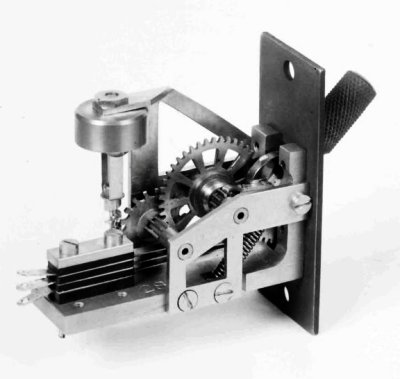 FIG. 4 - DELAYED ACTION LEVER - TYPE KEY (EXPERIMENTAL MODEL) Switchboard operators' positions are provided with a press button to give a clear when required on junction circuits to other switchboards. Operators are instructed to depress the clearing key for five seconds, to make certain a sufficiently long signal is always given to ensure satisfactory operation of supervisory signals. To simplify the operating procedure a delayed action lever time key has been recently developed for clearing purposes, which can be preset to give a spacing signal of the requisite duration. The operator simply depresses and then releases the key, which restores to normal under the control of a standard telephone dial governor. Fig. 4 illustrates, in its experimental form, the key which can be fitted to the present standard teleprinter table equipment. 3.3 Recall Facilities 3.4 Answering and Calling