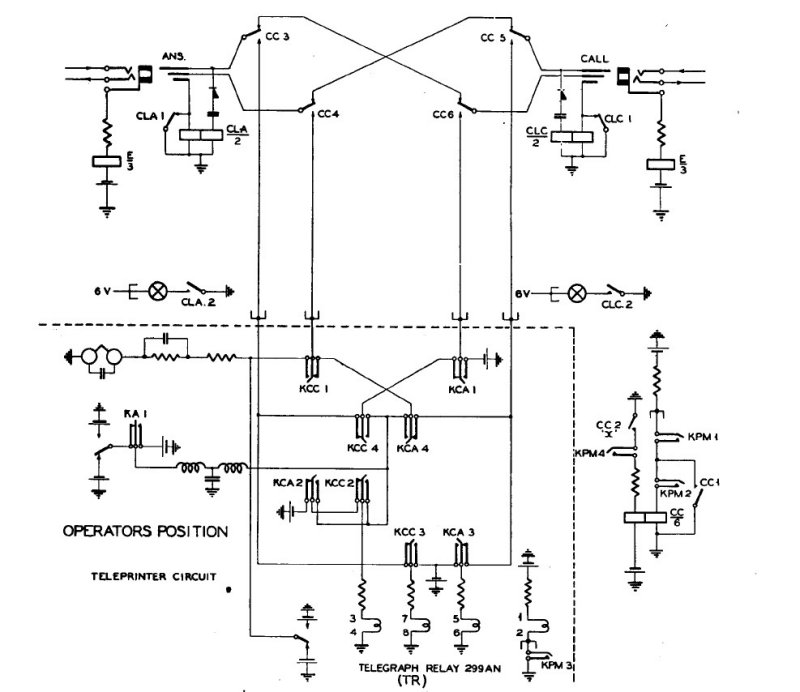 FIG. 5 - TELEPRINTER SWITCHBOARD - CORD CIRCUIT AND OPERATOR'S POSITION EQUIPMENT A position key which is common to the operator's position enables the operator's position circuit to be connected to either the answering or calling side, and in the normal position of the key the operator's teleprinter is connected to monitor the cord circuit. Normally the cord circuit is connected tip to ring via contacts of the switching relay CC. This provides a direct transmission path with negligible transmission loss from the send to receive lines of connected circuits. To answer a call the answering plug is inserted into the jack of the calling line, the position key KCA Js operated to answer and the cord circuit key KPM is operated. The operation of KPM energises the switching relay CC which operates and locks via the "X" contact CC2. Contact CC1 connects an earth to the common point of battery supply to the other cord circuit CC relays, so that these cannot be operated until the cord circuit already in use is restored to normal - thus preventing two cord circuits being connected together. Contact CC4 connects the send line of the calling circuit to the operator's teleprinter transmitter, while CC3 connects the receive line of the calling circuit to one coil of a telegraph relay TR. A second coil of this relay is connected to the operator's teleprinter transmitter, and the relay is also given a permanent spacing bias. The currents controlling the relay TR normally cause it to mark, but if either the calling subscriber or the operator transmits, the relay repeats the signals to the operator's teleprinter. Thus it will be seen that a simplex connection with local record facilities is established between the caller and the operator's teleprinter. The switchboard operator teleprints the call sign of the switchboard, whereupon the caller will teleprint the details of the connection required. The operator then inserts the calling plug into the jack of the line required and signals "K" or "THRU" depending whether the connection has been completed to a teleprinter extension or extended over a junction line to another switchboard for completion of the call. In the former case the caller operates the WRU key to confirm correct connection and then proceeds, whilst in the latter case he calls the second switchboard as before. The first switchboard operator will immediately restore the cord circuit key to normal thus releasing the switching relay CC and completing the through connection between the tip and ring of the answering and calling plugs, via the CC relay contacts. As the final operation the position key will be restored. It is important that the operation and restoration of the cord and position keys should be in the order described, otherwise the telegraph relay will operate to space and cause the operator's teleprinter to race. It is perhaps of interest to mention that the cord circuit facilities contemplated originally were that the parent switchboard operator should handle the call to completion and verify correct connection to the required party before switching the caller through. For this reason the cord circuit incorporates the facility, whereby all signals exchanged between the operator and the called party are repeated by the telegraph relay in the position circuit, to the operator's teleprinter and also to the calling subscriber. The calling subscriber's receive line is disconnected during this stage of the connection to prevent interference, but the caller is able to note the progress of the call at all stages. 3.5 Monitoring The monitoring circuit arrangements introduce a small transmission loss in the cord circuit but the effects are not appreciable, and in any event, as monitoring is usually only necessary at the termination of a call, and when a single clear only has been obtained, the transmission loss introduced is of small consequence. 3.6 Duplicate Connections Should a number of operators answer a call simultaneously, their transmitters will be connected in parallel to the send line of the calling subscriber. The first operator to teleprint will connect +80V to the common connection during the start signal and spacing elements of a character, and a heavy marking current will flow from the transmitters of the other position teleprinters to this battery. The respective A relays on each of these positions will therefore operate and contact A1 will complete the circuit for relay B which operates and locks via contact Bi. Contact B2 disconnects the teleprinter transmitter from the circuit and B3 causes the duplicate connection lamp on the position to glow. Thus the first operator to teleprint to the calling line automatically cuts off any other operators connected to the line. These operators will receive an indication by means of the duplicate connection lamp and will take down their cord and depress the duplicate connection reset key KR which disconnects the hold current of relay B which releases and restores the position circuit to normal.