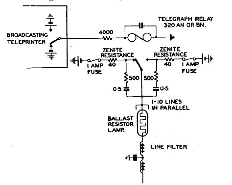 FIG. 7 - TELEPRINTER BROADCAST CIRCUIT It is of interest to mention the factors which have determined the choice of the circuit components used. The first is that when ±80V is transmitted into 10 lines in parallel the surge current may rise to 3 amps due to the capacities of the line and the low pass filter which is fitted in each line to prevent interference to adjacent telephone circuits. This will produce severe sparking at the relay contacts if bounce occurs and give rise to rapid contact build up until finally the contact gaps become choked, producing a short circuit and welding of the contacts and tongue. To reduce the surge currents and increase contact life, protective resistances are fitted in the battery feeds to the contacts, but as it is necessary, from the point of view of signal distortion, to limit the voltage drop which occurs to a minimum, it is necessary to keep the protective resistances as low as practicable. They should, however, be such that they will safely carry a 'short circuit current if this occurs and limit it to a value of 2 amps which is insufficient to produce welding of the contacts. The battery fuses are rated to blow under this condition. Sparking at the contacts is reduced to a minimum by a double spark quench circuit which consists of a 0.5uF condenser and 500ohm connected from the relay tongue to each contact this arrangement is found to be more satisfactory than a single quench circuit from tongue to earth. In order that faults occurring on one line shall not interfere with broadcast reception on the remaining lines, a ballast resistor bulb is fitted in series with each line. The characteristic of this resistor is 100 ohms when cold, rising to 700ohms when earthing a current of approximately 100 milliamps. Thus if a full earth occurs on one line it increases the load on the relay by approximately 0.1amp, but the increased distortion of signals which occurs on this account is not sufficient to prevent satisfactory reception on the remaining circuits and a visual indication of the earth fault is given by the resistor bulb glowing. Various broadcasting facilities are required by private wire renters, but the broadcast circuit is basically always the same and is as described in the foregoing. The differences between the various systems in use arise due to different supervisory requirements and the flexibility for partial broadcasts. Lines are sometimes set up permanently for broadcast reception from a central office and for this type of network a standard broadcast relay panel is available which is suitable for wall or rack mounting and which caters for broadcasting to 10 lines. The broadcasting teleprinter is connected to the coils of the broadcast relay of one of these panels which is situated at the most convenient point from which lines can radiate to the receiving teleprinters direct or to additional broadcast relays at other centres from which other lines radiate. Any number of receiving teleprinters can be connected to a broadcast network of this type provided that where more than 10 lines are to be connected in broadcast at any point in the system then a number of broadcast relays will be connected in series so that only 10 lines are connected from the transmitting tongue of any one relay. Usually supervisory signalling is required in a broadcast network to enable acknowledgement of reception to be given and a broadcast switchboard is then used. One type of switchboard used for this purpose but suitable for short physical lines only, has already been mentioned, but this type is now obsolescent due to demands for intercommunication facilities in addition to broadcasting. As a result all intercommunication teleprinter switchboards either incorporate facilities for broadcasting as a standard arrangement or may be worked in association with a broadcast switchboard. A typical circuit arrangement in principle is shown in Fig. 8. The line is connected to the switchboard multiple via a broadcast key on the switchboard face equipment, and in the normal position of the key the line is connected to the switchboard line calling equipment as already described. One or more groups of broadcast relays are provided, the coils of which are wired to broadcast jacks in the multiple; only a single group of relays, and associated line keys and broadcast jack, are shown in Fig. 8.