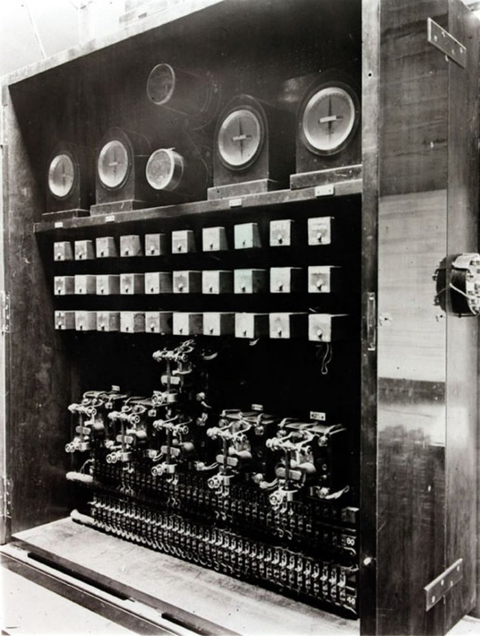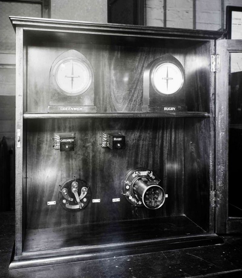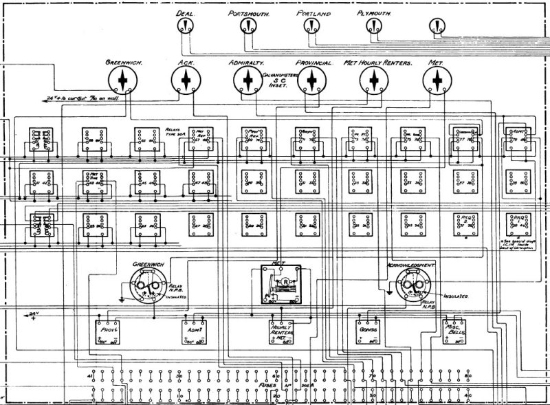 This is a very basic overview and not intended as a definitive description. The operational details were taken from the Technical Instruction on Clocks dated 1927. Accurate time was not an issue in the UK until the introduction of the railways in the 1830's, which found that the various local times in use around the country, which varied by up to 30 minutes, were not conducive for the production of timetables on infrastructure that crossed the UK. The railways needed to standardise time. Electric clocks were introduced in the 1840's and telegraphy circuits sent time signals to stations and Post Offices situated close to the new railways. Greenwich Mean Time (GMT) was adopted as the standard in the UK in 1880 and worldwide in 1884, which made life a lot easier. The Post Office obviously used GMT and this was essential for the regulations and paperwork supporting the UK wide Telegraph system. Originally time signals would be sent in coded format by Morse code. Click here for the instruction. The Central Telegraph Office (CTO) in London was fitted with a Control Clock and Chronopher (An instrument for transmitting records of time (as by a standard clock), by means of electricity, to distant points) which was synchronised by means of a mechanism attached to the Mean Time Clock at Greenwich Observatory. The Greenwich Observatory sent an electrical signal, at selected times, through an underground wire. For security of service, a second underground wire on a different route was always available between the Observatory and the CTO. The Greenwich Observatory sent time signals at 10.00 and 13.00 hours, which were monitored to ensure receipt at the CTO. The CTO Chronopher was then used to distribute time signals to; Distribution centres, Telegraph offices in the UK, Big Ben, Admiralty time balls, Railway Termini and private businesses that paid for a GMT connection. After receipt of the 13.00 signal, an additional operation then sent a signal to the Admiralty Stations. At the Admiralty Stations the signal operated time balls; at Deal (at 1h 0m 10s), Portsmouth (at 1h 0m 20s), Portland (at 1h 0m 30s) and Plymouth (at 1h 0m 39s). In all cases a signal was returned as proof of receipt. In the event of a 13.00 hour signal not being sent, a special signal would be sent at 14.00 hours. The CTO could also patch the circuits to a 14.00 hour signal as a temporary expediency. Private businesses were supplied with a wires only circuit and they would have to provide their own receivers. These receivers would normally earth the incoming wires to ensure that no spurious voltages interfered with the time system. This earth would be removed just prior to any signal received and replaced soon afterwards. The CTO Chronopher also sent signals every hour. At each Distribution centre the received time signals actuate a sub-chronopher which is similar too but smaller the main CTO chronopher. The sub-chronopher distributes the signal to the local telegraph circuits in the same way as the CTO chronopher distributes to the sub-chronophers. Many Post Office buildings and exchanges also had their own control clock which synchronised with the CTO. These control clocks were connected to the internal building clocks, via a relay, to ensure GMT uniformity. The building clocks were 30 second pulse clocks. Where no synchronisation was available, a switch next to the control clock would be used to advance or retard the building clocks. These systems were supported by a battery backup. In 1927 the Rugby Radio Station transmitted time signals which enabled shipping all over the world to synchronise their chronometers with GMT. GMT was fed from Greenwich to the CTO and then onward to Rugby, a distance of 94 miles. There are Galvanometers on each circuit and these are sensitive devices that respond to current on the circuits, showing if the circuits are working or not. CTO Control Clock for the main Chronopher At two minutes to the hour a contact is made and a battery brought into action which operates the relays, thus disconnecting the time-wires from their working sets and preparing the way for the passage of the time signal at the hour. This battery current is known as the "Preliminary" and its object is to warn the various offices and renters to prepare for the actual time signal. Exactly at the hour, Greenwich Observatory sends the Time signal in the form of a current, the duration of which is one second in the reverse direction to that of the "Preliminary" signal of the control clock. When the Time signal has passed, the preliminary current is restored for a further period of 2 minutes 8 seconds. At 1 p.m., however, an additional operation takes place after the Time signal has passed. At certain Admiralty Stations, viz. Portsmouth, Portland and Plymouth, switching arrangements are introduced to enable these stations to send a return signal or acknowledgment to Greenwich for the purpose of enabling the Observatory to check the performance of the clocks at the stations. In order that this may be done, the preliminary current is cut off at 5 seconds after 1 p.m. leaving the line clear for the transmission of the return signals. At 1hr 1m 20s the preliminary current is restored until 1h 2m 8s, when the lines arc again transferred to their working sets. The Chronopher In the case of Admiralty circuits, Indicator I shows the transmission through R3 of return acknowledgment signals to Greenwich.