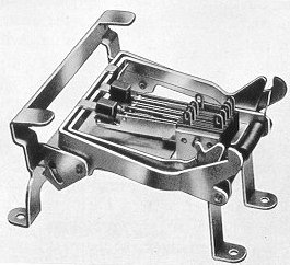 simple unit (Fig. 9) provides the mechanism for this purpose ; it comprises the springset, the inner and outer levers operating the contacts and linking with the selector button units, and a further member which follows the cradle plunger movement (in either the wall or the table set position) and transfers it to the outer springset operating lever. Very careful consideration has been given to the profiles of the engaging surfaces and to centre distances and arcs of movement, in order to ensure a rolling rather than a sliding action between the metal parts. Rollers are fitted on the moving contact