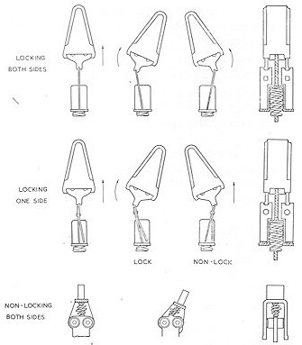 Locking is achieved by a toggle action with a compression spring housed in a central bush holding against the load of the contact springs. For keys which are non-locking on one side a special toggle plate is used to change the direction of the forces so that the cam returns to normal on release. Where a completely non-locking key is required there is no need for the toggle action and the cam is centralized by a small compression spring fitted between cam and frame. Fig. 7 shows the various types of action.