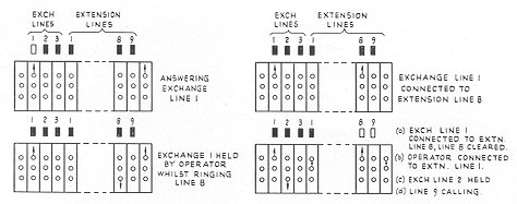 The switchboard provides the usual facilities for connecting and supervising calls between local extensions and between exchange lines and local extensions. Each line is equipped with keys arranged in vertical rows beneath the associated call indicator, and the key handles can be moved up or down, each position operating in effect a separate key. With the key units mounted side by side the key handles also form horizontal rows. To connect two lines together a key for each line on the same horizontal row is operated in the same direction.