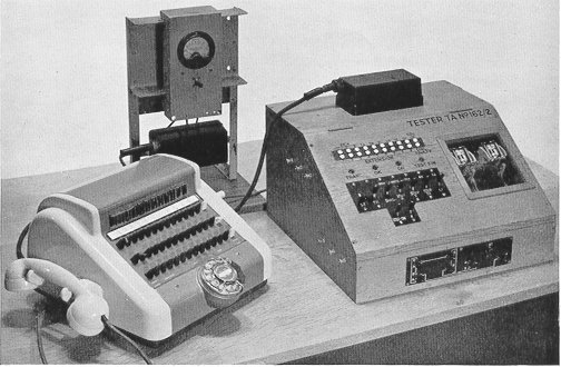 of bridging, meggering and full functional tests. The functional tests cover all conditions, including incoming and outgoing calls on main exchange lines, connection of each extension to each exchange line, and interconnection of all extension lines. The equipment (Fig. 13) used for these tests applies each condition automatically by means of a sequence switch and enables the inspector to complete all tests in from five to eight minutes, depending on the size of the board concerned, in spite of the large number of manual operations necessary to check the correct functioning of all the switchboard lever keys. The transmission of the speaking bridges is checked by means of a power level meter.