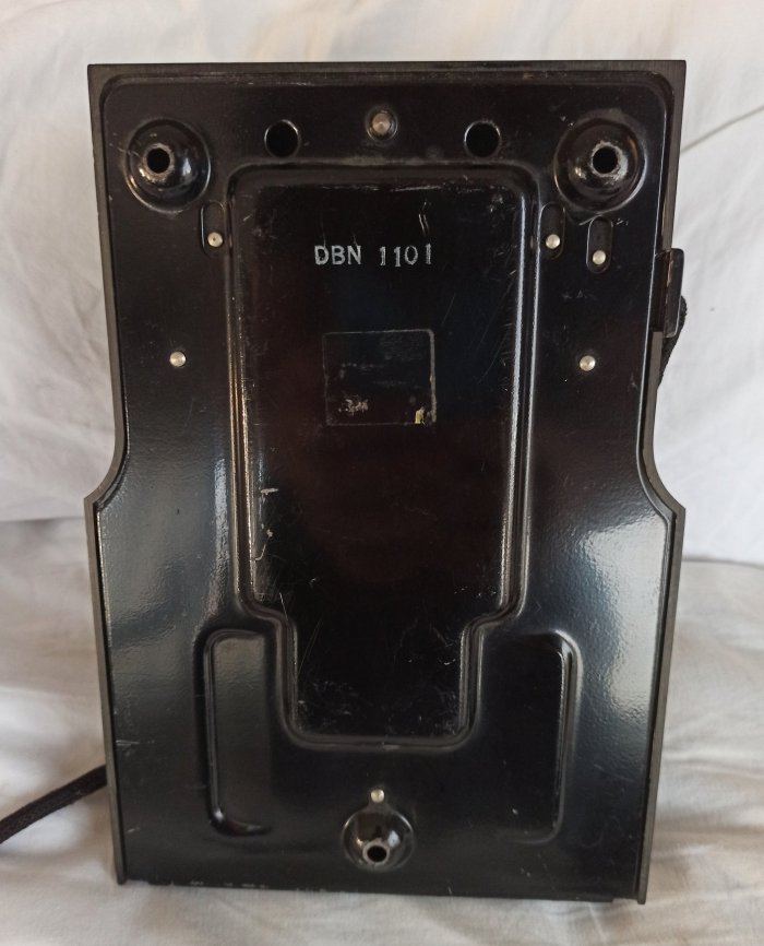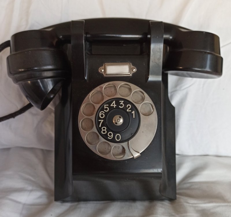 telephone has a dial. The inner parts are mounted on the bottom plate