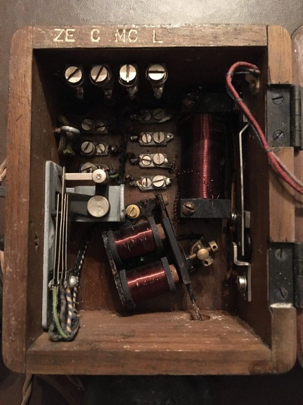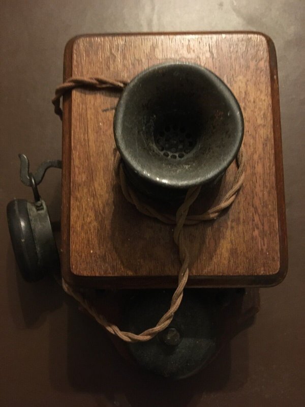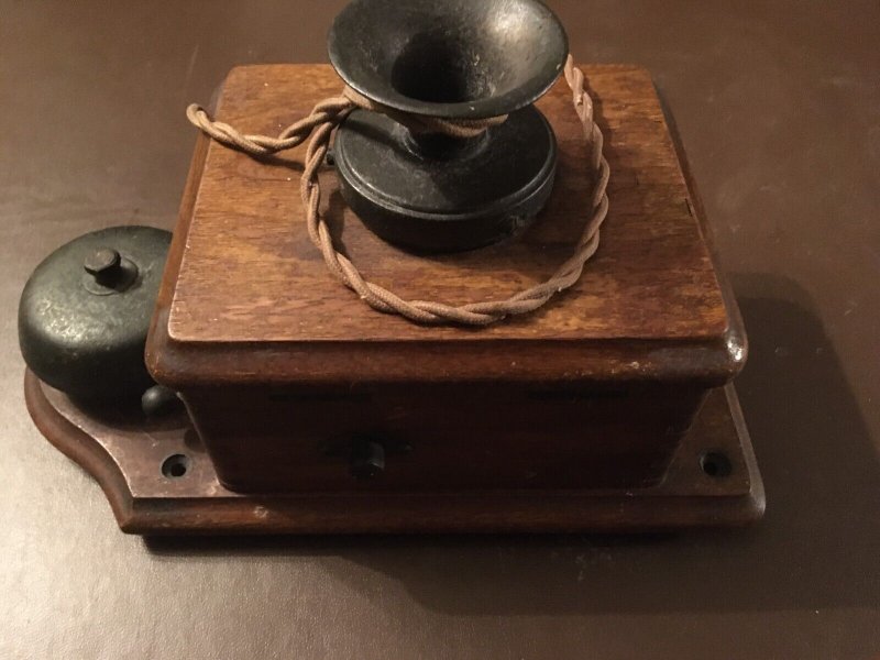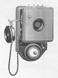 Wall phone, made of polished Walnut with inset transmitter and automatic switch hook. Push Button at side of case. Cost in the 1916 catalogue was £0.17.6 Additional Pictures