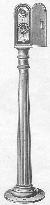 Street Telephone Post Consisting of Granular Transmitter, Double Pole Receiver, Automatic Switch, Induction Coil and Condenser, with Terminals for connecting a Polarised Bell. These parts are mounted in a Cast Brass Containing Case, which is then fixed bodily in the Post Head. The Receiver and Transmitter can be readily removed and replaced without taking out the whole apparatus. A very useful Street Telephone for any purpose. Price was £12.0.0. Height out of the ground, 5 feet.