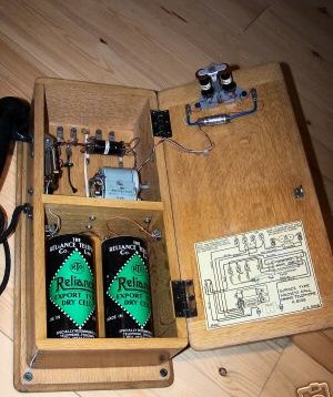This instrument is intended to be used at the surface of a coal mine as a means of communication between the surface and an intrinsically safe underground system. The cabinet is well seasoned oak with a compartment to hold two 1.5 volt dry cells. The equipment consists of a generator with an "Alnico" magnet system, polarised twin gong magneto bell and induction coil, safety shunt, capacitor and automatic switch-hook. The 'Gecophone' hand-combination is fitted with a damp-proof cord. Terminals are provided for an extension bell. The circuit includes a safety shunt on capacitor. Certification Dimensions Height - 18.5 inches (47cm) Weight Cost in 1935 was £9.10.0