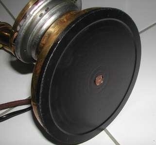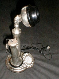 The bell receiver was an old style magnet receiver which is quite weighty. The picture to the right shows a real GPO bell receiver broken down. The receiver cover was black (although the housing was made of brass) and had a finish of Ebonite applied to it (Ebonite is a hard substance made of rubber and fortified with sulphur). It was also used for the earcaps and terminal blocks. These receivers have gone brown over the years and in a lot of cases, the Ebonite has fallen off. Always ensure that the original earpiece cover is fitted, as this is a slimmer version of the 100 & 200 telephone earpiece and generally has a single dimple on the edge. The base is a casting and has a rubber insert all the way around the base, close to the edge. It is fixed to the stem by a single central screw. The Candlestick telephone always needs a Bellset No. 1 (wooden) or Bellset No. 25 (Bakelite) to actually work. These Bellsets consist of bell ringer mechanism, capacitor and an induction coil and are rarely found now days. A Bellset No. 41 will not work at all! Try and buy your Candlestick with the correct Bellset. REPRODUCTIONS A number of fabricators, all British, have made quite convincing replicas of the Telephone No. 150. One style was in production for twenty years or more, so that the early example can now look genuinely old. The give-away is that the bases and stems are made of brass, not steel, although these are often covered with black paint. Another manufacturer based in the north of England was using a mixture of genuine bases, stems and mouthpiece assemblies together with reproduction bell receivers and switch-hook assemblies. The give-away here is that the type number and manufacturer markings are stamped, not engraved, and are always No. 150 with manufacturer code PX. This firm had its own supply of original plaited cordage, which added a genuine air to these replicas. The same switch-hook assemblies were used to make up fake wooden Telephones No. 121 from No. 1 Bellsets and because the woodwork was original, the telephones look genuinely old and realistic enough to fool the average buyer. The latest fake candlesticks have a chrome finish (never seen on the real thing in Britain) and have the letters GEC impressed into the stem in a script lettering. See them below - they are 100 per cent bogus. They also come in black and gold colours and never need a Bellset!!! Click here for pictures of a real Candlestick in need of refurbishment Click here for a real Candlestick being dismantled