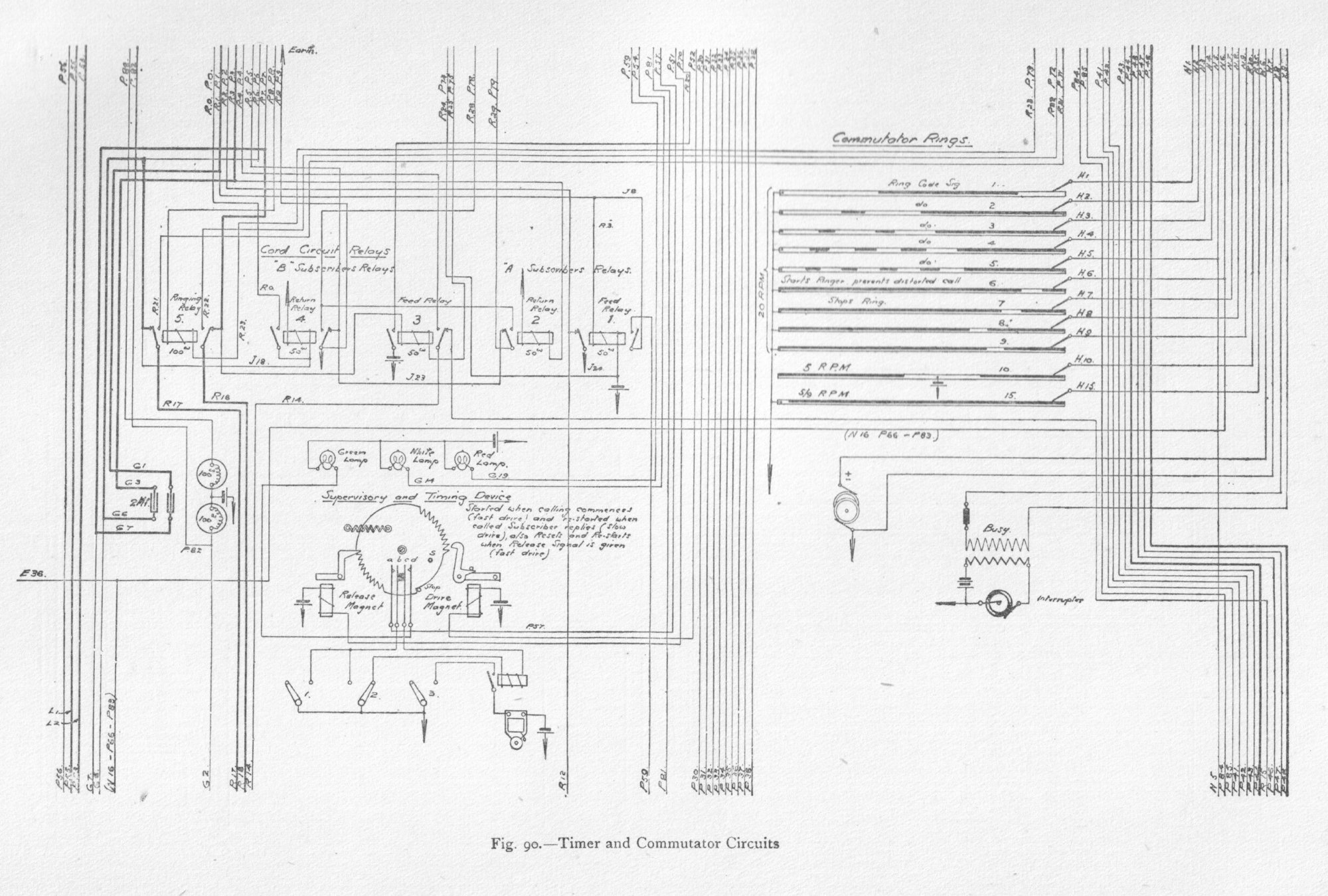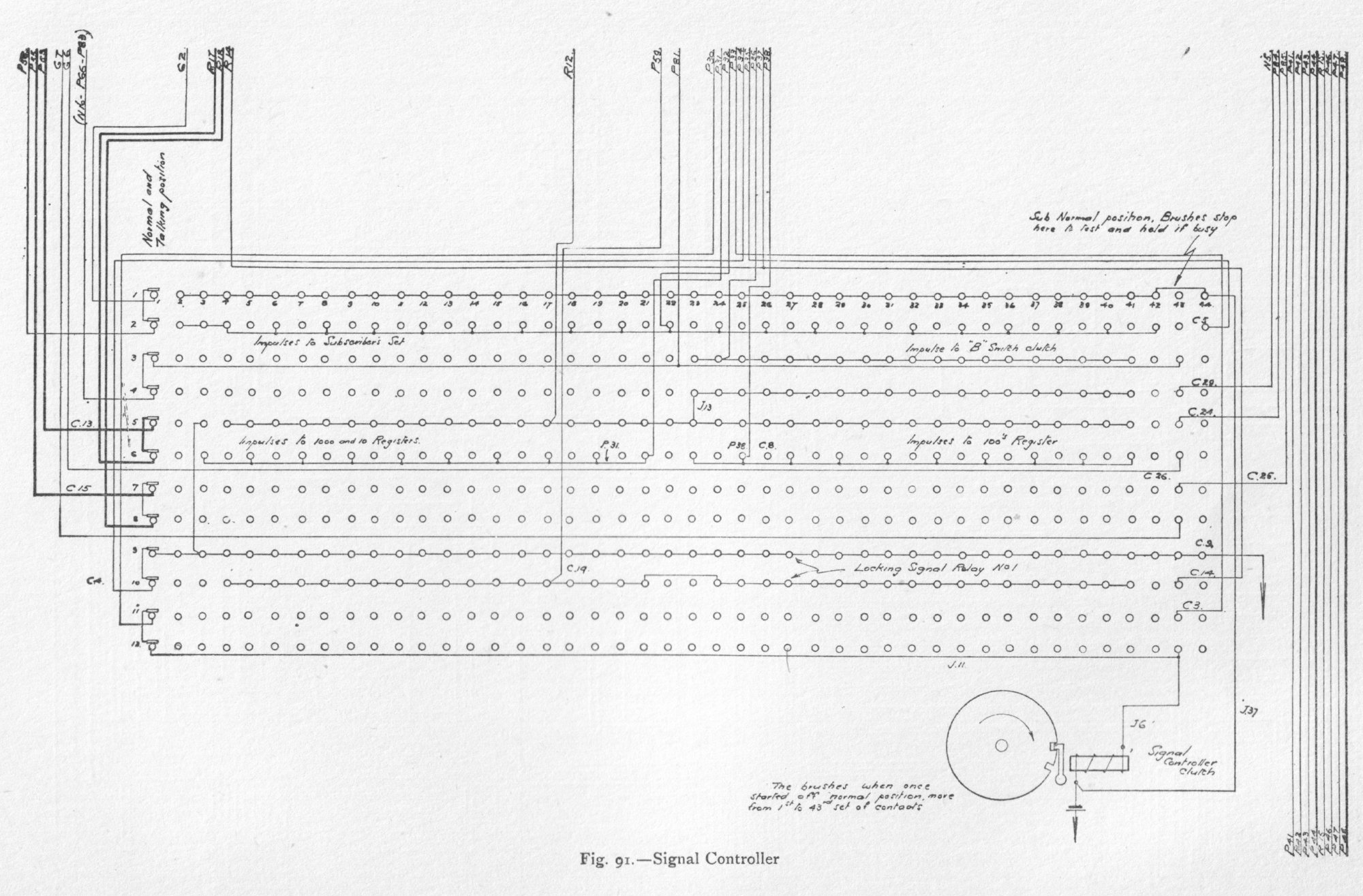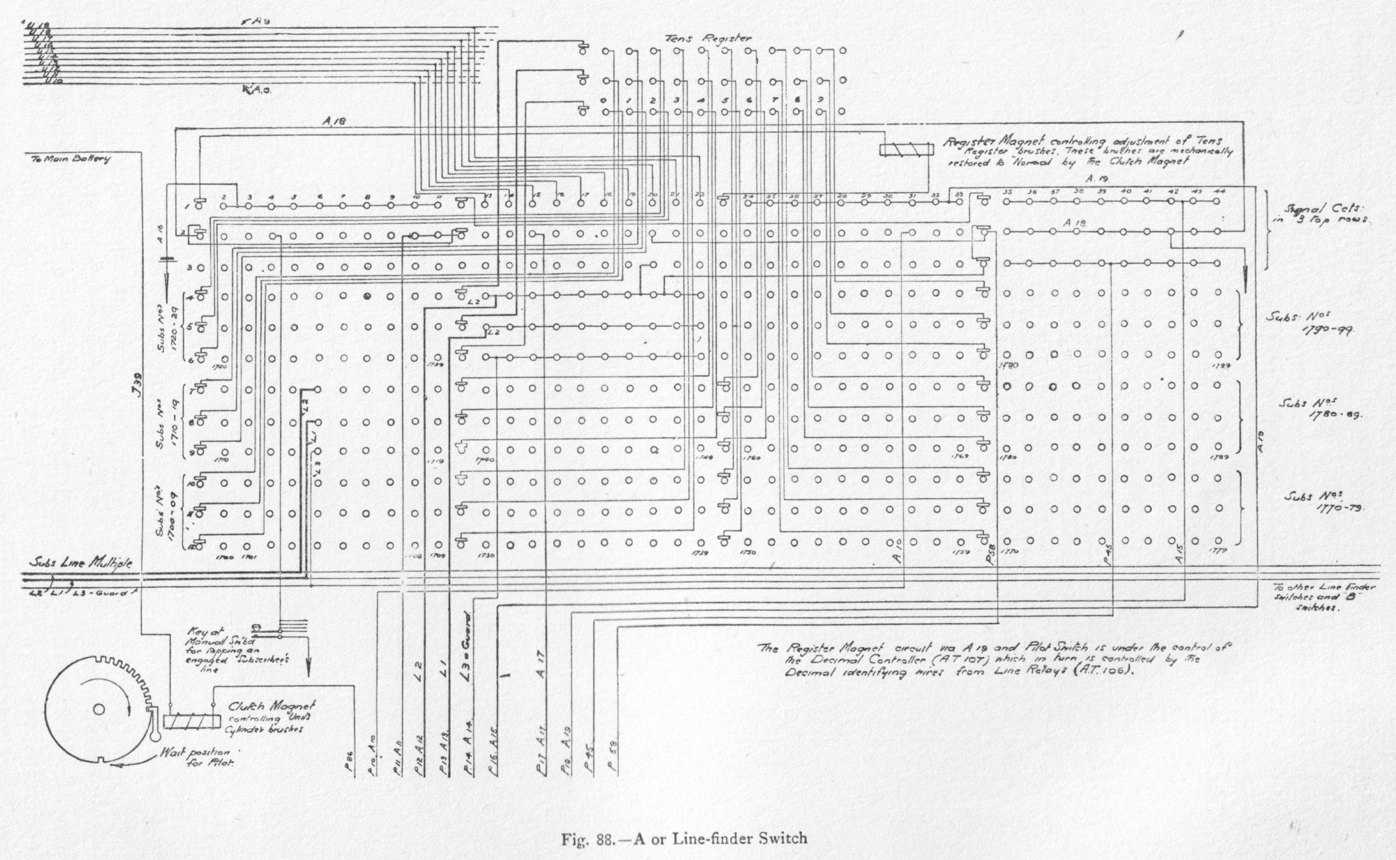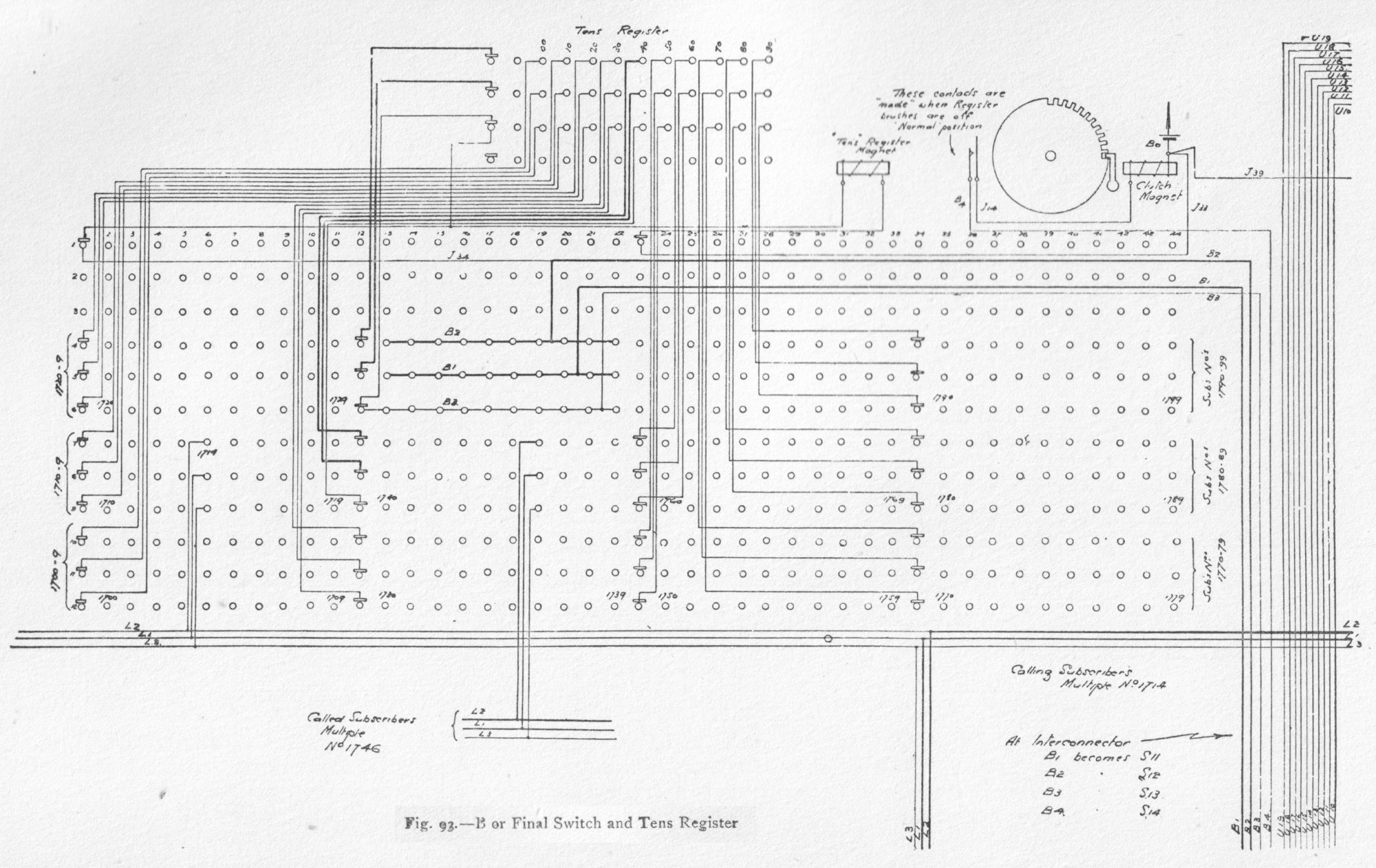 The subscriber's speaking circuit consists of a combination of two non-inductive resistances and two bridging coils, with the receiver in bridge. Elevation and general views of the apparatus are shown in figs. 70 and 71. The drive motors are of 1 horse-power each. One motor is sufficient to drive twelve switch-boards, each having seven consecutive divisions. The power is transmitted by belt to the main shaft, which is carried at right angles to each switching unit, as in fig. 71, and by means of gearing keeps in continuous rotation, at a uniform speed, the horizontal main shaft of each switch-board, which in turn is geared to eight vertical shafts, as in fig. 79. Clutches are provided to release any defective part from the driving-shaft, thus preventing accident to one part from affecting the operation of the other parts. The moving parts of the switches, i.e. the wipers, are driven by machine power transmitted by the vertical shafts, and the distance and times of their movement are under magnetic control by means of a loose gearing, as will be explained. The construction of all the cylinder switches, A, B, signal controller, interconnector, pilot and division starter, is similar. External and sectional views of these cylinder switches are given in figs. 74 to 84. Fig. 90. - Timer and Commutator Circuits Fig. 92. - Interconnector Switch and Hundreds register Fig. 93. - B or Final Switch and Tens Register The tags, 60, are first fixed in position in a made-up metal mould. A mixture of plaster of Paris and water is then poured into it, and, as the cement solidifies, the tags become embedded in the mixture. The whole is placed in an oven and baked, after which the metal mould is taken to pieces and removed. The plaster of Paris cylinder with its tags is then immersed in a mixture of paraffin and Brazilian wax, raised to a temperature above that of the boiling-point of water, but below that of boiling paraffin; it is then removed and allowed to cool. The Brazilian wax prevents absorption of moisture, and counteracts the hygroscopic nature of the paraffin. The cylinder is finally varnished with shellac. The tags and wipers are of German silver. The wipers, which consist of two flat springs and make contact with both faces of the tag contacts, are fitted in a cast-iron spider and insulated by means of India-rubber. The speed of the cylinder wipers is 24 revolutions per minute, with the exception of those of the B switch, which make 12 revolutions per minute. An examination of figs. 74, 75, 76, 78, 79, 82, and 83