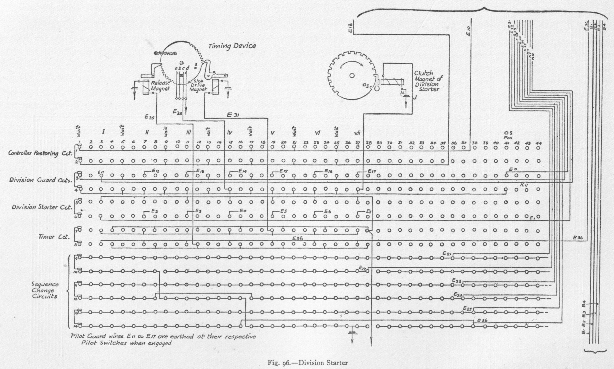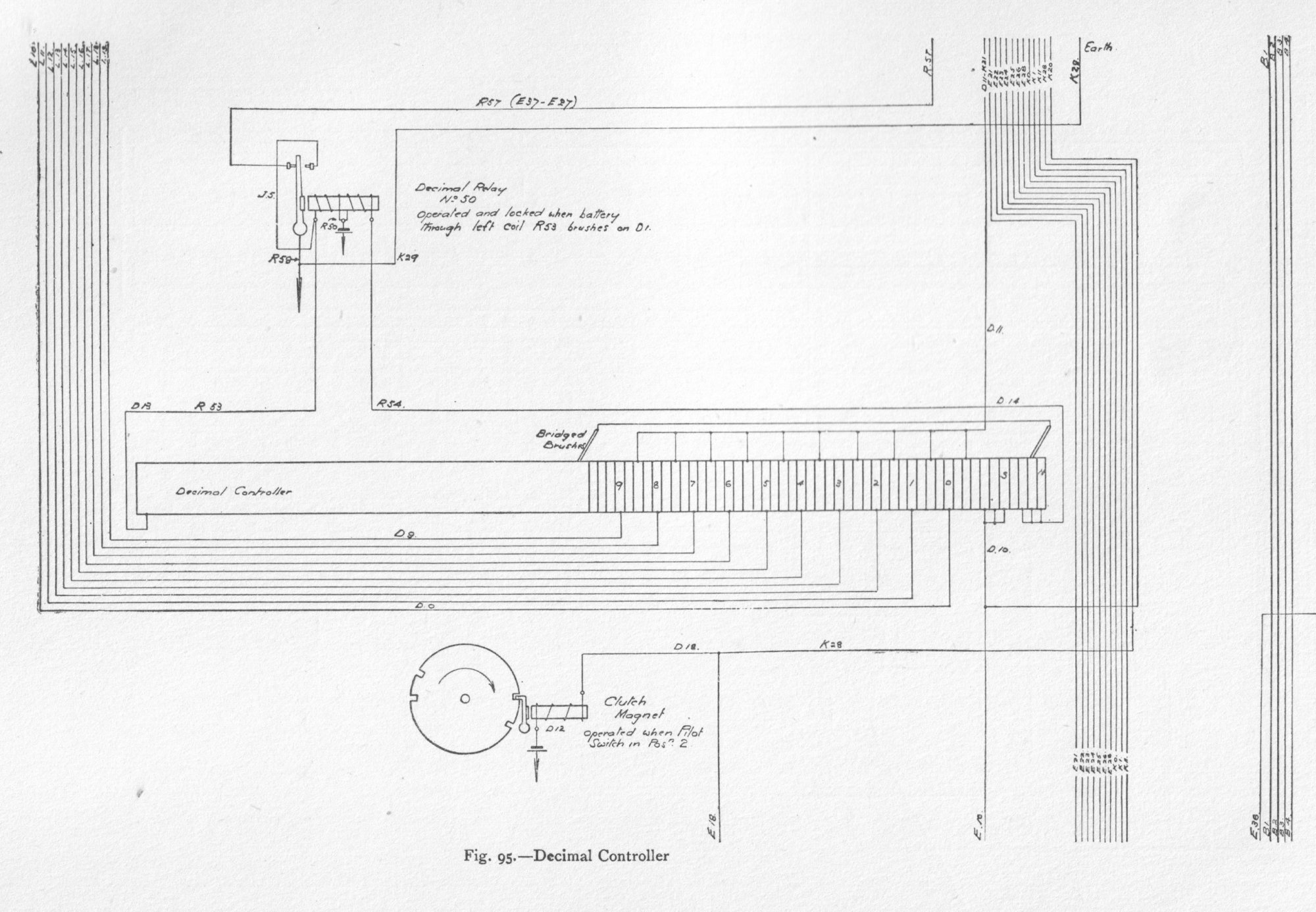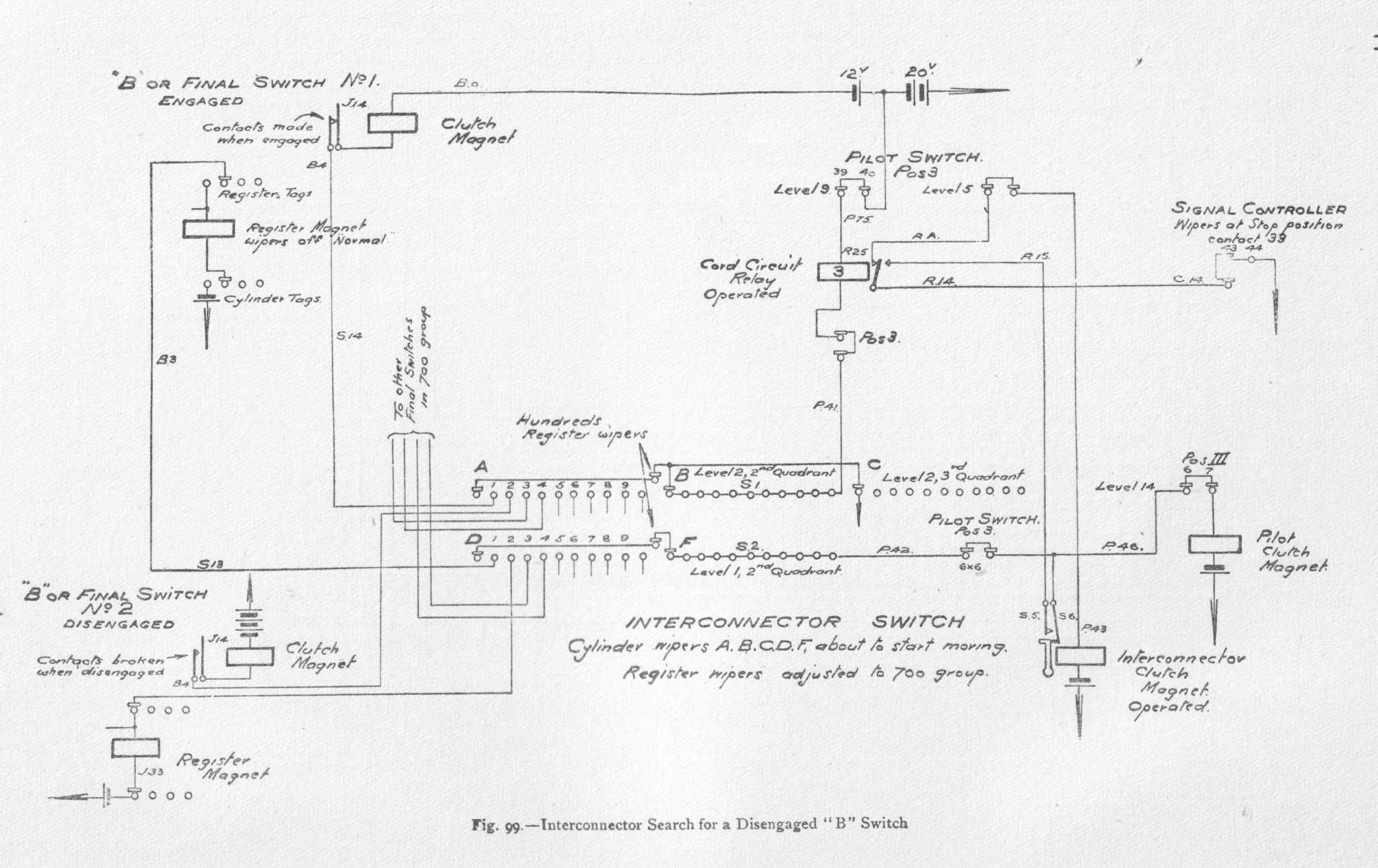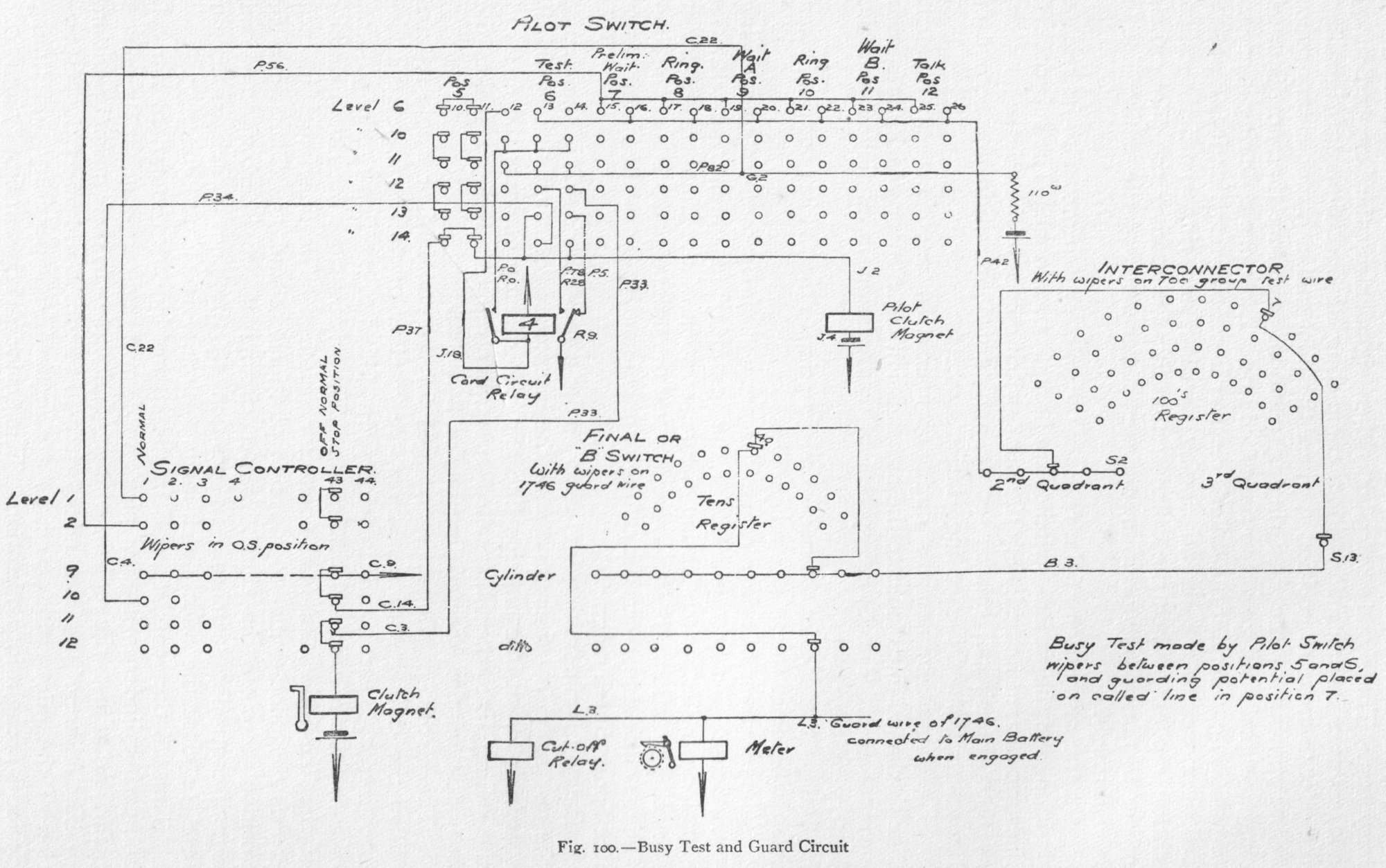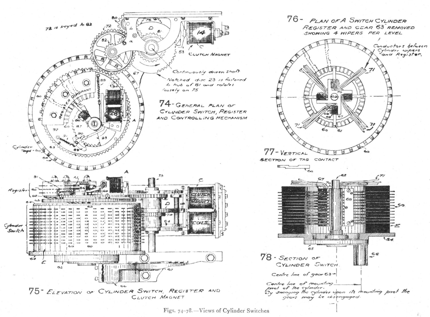 The subscriber's speaking circuit consists of a combination of two non-inductive resistances and two bridging coils, with the receiver in bridge. Elevation and general views of the apparatus are shown in figs. 70 and 71. The drive motors are of 1 horse-power each. One motor is sufficient to drive twelve switch-boards, each having seven consecutive divisions. The power is transmitted by belt to the main shaft, which is carried at right angles to each switching unit, as in fig. 71, and by means of gearing keeps in continuous rotation, at a uniform speed, the horizontal main shaft of each switch-board, which in turn is geared to eight vertical shafts, as in fig. 79. Clutches are provided to release any defective part from the driving-shaft, thus preventing accident to one part from affecting the operation of the other parts. The moving parts of the switches, i.e. the wipers, are driven by machine power transmitted by the vertical shafts, and the distance and times of their movement are under magnetic control by means of a loose gearing, as will be explained. The construction of all the cylinder switches, A, B, signal controller, interconnector, pilot and division starter, is similar. External and sectional views of these cylinder switches are given in figs. 74 to 84. Fig. 90. - Timer and Commutator Circuits Fig. 92. - Interconnector Switch and Hundreds register Fig. 93. - B or Final Switch and Tens Register The tags, 60, are first fixed in position in a made-up metal mould. A mixture of plaster of Paris and water is then poured into it, and, as the cement solidifies, the tags become embedded in the mixture. The whole is placed in an oven and baked, after which the metal mould is taken to pieces and removed. The plaster of Paris cylinder with its tags is then immersed in a mixture of paraffin and Brazilian wax, raised to a temperature above that of the boiling-point of water, but below that of boiling paraffin; it is then removed and allowed to cool. The Brazilian wax prevents absorption of moisture, and counteracts the hygroscopic nature of the paraffin. The cylinder is finally varnished with shellac. The tags and wipers are of German silver. The wipers, which consist of two flat springs and make contact with both faces of the tag contacts, are fitted in a cast-iron spider and insulated by means of India-rubber. The speed of the cylinder wipers is 24 revolutions per minute, with the exception of those of the B switch, which make 12 revolutions per minute. An examination of figs. 74, 75, 76, 78, 79, 82, and 83