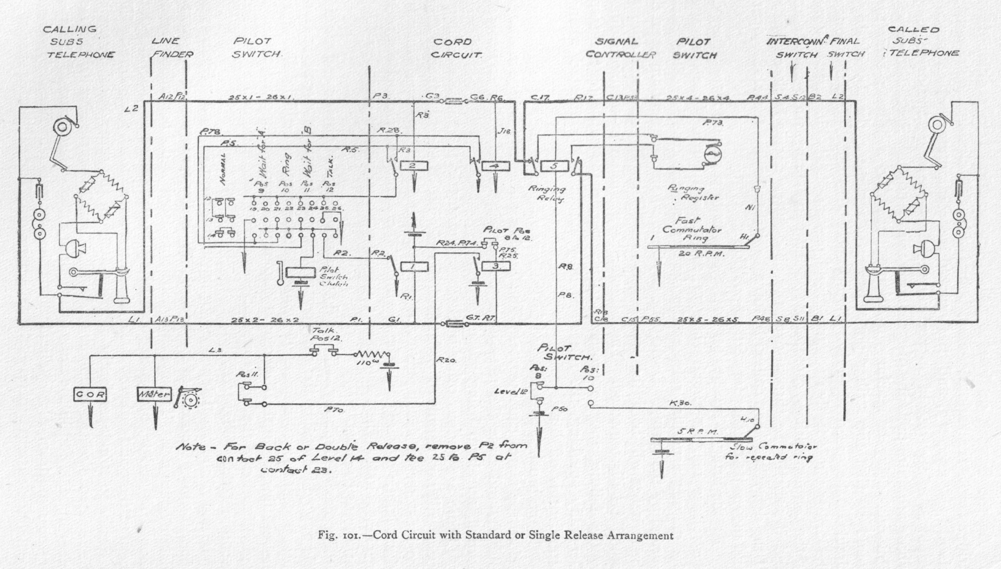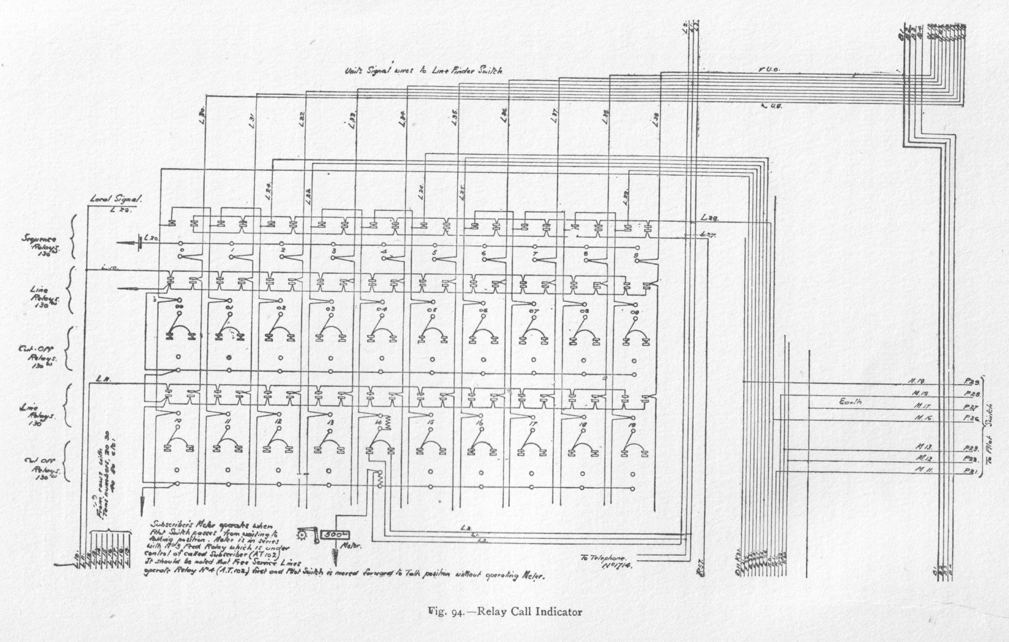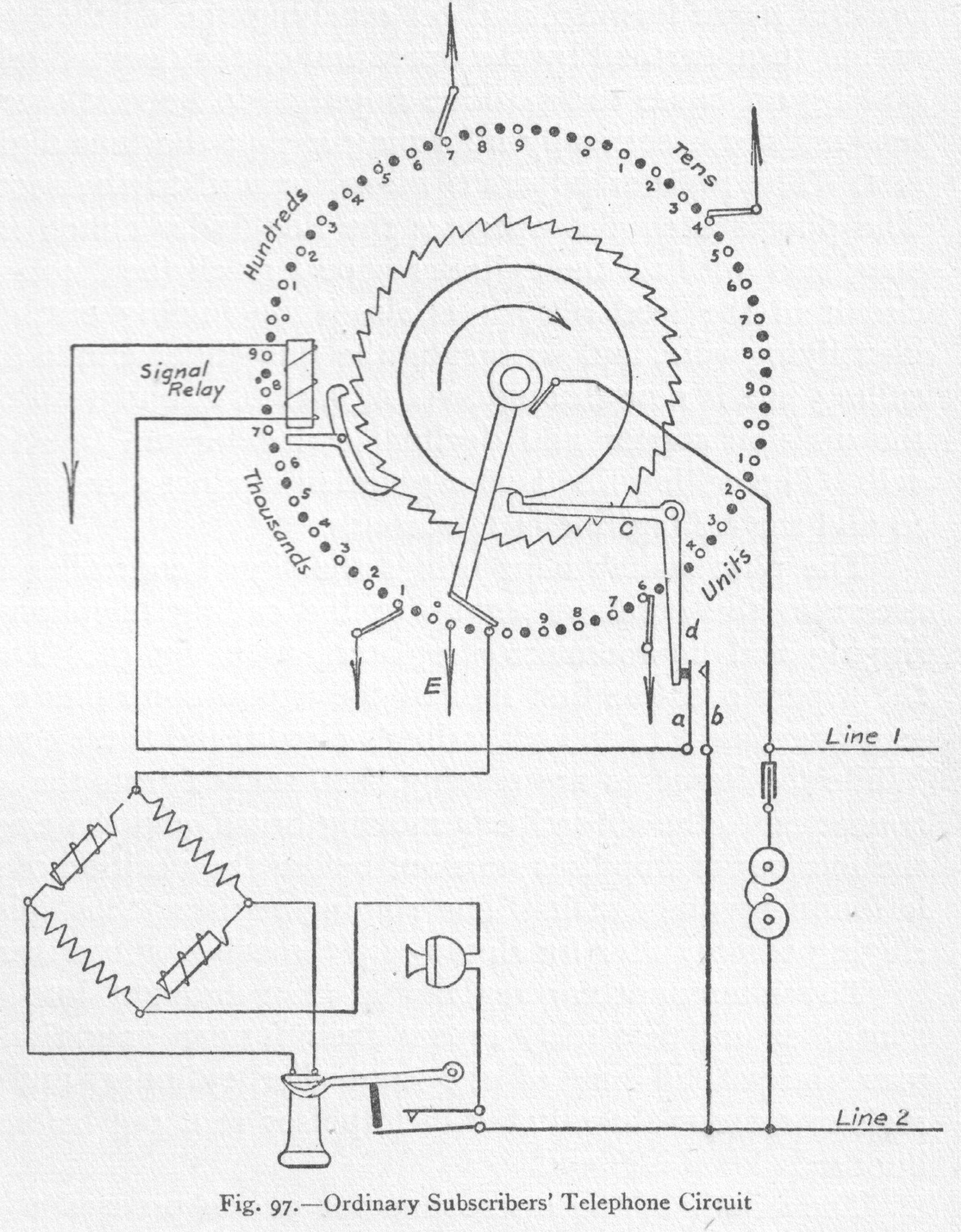 The wipers move accordingly. It should be noted that 63 also carries plate 92, on which the register mechanism is mounted. The register moves as a whole with 63; the relative positions of its wipers and contacts are unaffected at this stage. The chamfered edges of the teeth of disc 23 assist 83 in rising clear of the notch should the impulse through the clutch magnet be brief, and so long as 83 rides on the ridge of 23 the rotation of 63 and 23 must continue. Thus the stop positions of the wipers and the number of contact points passed over depend upon the positions of the notches in 23; these positions are varied with each switch, as will be seen by comparing the notched discs in figs. 72 and 88 to 96. The adjustable antagonistic spring 73, shown in figs. 79 and 80, causes the restoration of 83 to its normal position immediately a notch comes within range after the clutch magnet is de-energized. Plan views of the register are given in figs. 82, 83, and 74, and these, when considered together, explain the actions of the register, which is mounted on 92. Fig. 83 shows the wipers in their normal position, with the spring 88 in tension. The spring has a flexible strap which passes round B, and is fixed to a pin in the sector 87, close to 86. When an impulse passes through the register magnet 28 the armature extension strikes the arm 90 of the scape lever 89. Escapement sector 87 therefore shifts its position in the direction of the arrow in fig. 83, and moves the wiper 61 to the next contact point. After five such impulses the wipers will be in the position as shown in fig. 74. Ten impulses cause the brush to assume the position shown in fig. 82, and this is as far as the wipers may move, being stopped at this point by mechanical means. Fig. 94. - Relay Call Indicator To understand how the combination is brought into its normal position, as in fig. 83, it is necessary to explain that A in fig. 82 is the pivotal centre of the plate 92, which carries the sector, and that the pivotal centre B of the sector itself is eccentric to A, consequently when the release of the cylinder switch takes place the plate 92 moves round with it, and if the wipers are off their normal position, 93 will be at such an angle that it strikes against 94, rigidly fixed to the permanent framework. The toothed sector 87, with its wipers, therefore remains stationary, whilst the register contact frame E rotates with 92, and its contacts move past the wipers. When E reaches the position as shown in fig. 83 the normal tags have been brought into contact with the wipers, the eccentric action has shifted 93 clear of 94, spring 88 has been put once more in tension, and the scape lever and pallet 89 and 90 have been carried along with the mounting plate 92 to the end of 87. The combined cylinder and register switch can be swung out for examination as indicated in fig. 78. The decimal controller shown in fig. 72 diagrammatically as a bar, half of which is split up into small segments, is actually a commutator ring, and the brushes are placed at opposite points on its diameter, as shown in figs. 85 and 86. Its action is very simple. When the clutch magnet is energized, the toothed wheel 180 rotates, and carries the two brushes with it around the commutator. The solid half is the collector segment, to which the brushes connect the small segments in succession. The Lorimer system is essentially a wiring scheme, and a full description of the many circuits cannot be given, but in order to give as clear an indication as possible of the actual working, the operations involved in setting up a call between two subscribers may be indicated. Fig. 97. - Ordinary Subscribers' Telephone Circuit Assuming that line No. 1714 sets up a call (fig. 97), then its line relay on the 1-700 group operates, and with it the sequence relay 04, as shown in fig. 72. The No. 4 units and the No. 1 tens identifying wires are earthed, thus signifying that a line having 4 as its "units" digit and 1 as its "tens" is calling. The sequence relay starts the division starter hunting for an idle connective division, and when one is found the pilot switch is energized, and this brings in the A switch to find the calling line. Simultaneously with this action the decimal controller is operated; its brushes move forward, and on reaching the earthed tens identifying wire are, in turn, earthed by the operation of the decimal relay. These brushes, passing on, cause two positive impulses to be sent over D 11 wire to the tens register, electrically informing it that the tens digit of the calling line is 1. The register wipers D move forward to the second tens contacts C. The pilot switch also operates the line-finder clutch magnet and keeps it energized until all the cylinder wipers reach the No. 4 units tags, when the circuit of the feed relay i is closed by finding earth on the No. 4 units identifying wire, and so breaks the line-finder clutch-magnet circuit. The calling line is now through, via A, B, C, D, E, and F to the pilot switch, and the division starter and decimal controller are free to attend to another call. The calling line is also guarded against other calls. The time taken to find the calling line is 1.25 seconds. The pilot switch next brings the signal controller switch into action to ascertain the numbers set up at the calling telephone and to adjust the ringing and interconnector registers, as in fig. 98. During the passage of the wipers over the first half of the signal controller cylinder impulses are sent over line 2 of the subscriber's circuit, and these operate his mechanism. While the impulses are passing, feed relay I tests the second wire, which is connected to the subscriber's moving brush, and the ringing register records the number of impulses sent out before the position of the thousands lever is found by the brush. The ringing register thus joins up the particular ringing commutator for ringing up the called subscriber. The interconnector regis
