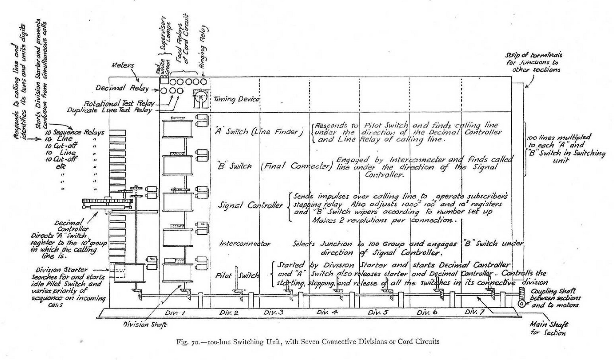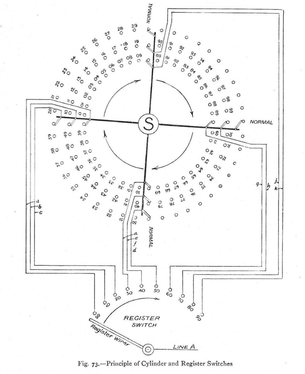 Fig. 66. - Lorimer Wall Telephone with Levers set to call No. 9641 (shown to the right) Fig. 67. - Lorimer Table Telephone with Calling Mechanism removed from Cover Fig. 68. - Lorimer Calling Mechanism (two curved number stripes removed) The levers and numbers are not affected by the connecting up and have no normal position, remaining wherever placed by the subscriber, so that if the wrong number is obtained a check with the number in the directory of the subscriber wanted will at once show where the trouble has arisen. The exchange switching apparatus is operated by coupling it to a constantly moving shaft shown in figs. 70 and 71. The movements of the switches are therefore uniform, and not under the control of any variable signalling apparatus at the subscriber's end; as already explained, the switches control the movement of the subscriber's calling device. This shaft is now the only continuously moving portion of the apparatus, as the decimal indicator has been superseded by line and cut-off relays. Fig. 69. - Lorimer Wall Telephone, showing Right-hand View of Calling Mechanism Fig. 70 - 100 Line Switching Unit, with Seven Connective Divisions or Cord Circuits The line of the calling subscriber is searched after and found by the wipers of the A or line-finder switch of the connective division which is attending to the call. The calling line does not directly find a disengaged switching apparatus, but a disengaged switching apparatus is brought into action to find the calling line. Fig. 71. - Main Shaft and Drive Wheel Fig. 72 - Circuits Involved in Calling a Line The private and line banks are not separated, but fitted in adjacent positions in the same cylinder, as shown at AL 1, AL 2, AL 3 in fig. 72. These cylinders also contain signal and battery feed tags. An individual wiper is provided for each level of contacts. There is not combined "up and around" movement as in other systems, such as the Strowger. In the A, B, and inter-connector switches there are actually four wipers per row spaced out horizontally 90 degrees apart. Some of the wipers in the various switches are paired vertically, others horizontally, but in whatever combination they may be arranged, or however spaced, the wipers in the same cylinder switch are each fitted to the common gearing of that switch and move together, making contact with the points in their own level as they pass along. The cylinder wipers rotate in one direction only, and pass from normal to active positions and return from active to their normal positions in a clock-wise direction, thus performing a complete revolution in a horizontal plane. Fig. 73 illustrates the principle of the cylinder and register switches, which form a complete A or B connector switch, and also may be used to represent the inter-connector switch. The hundred circuits are distributed over the four quadrants as shown. The ten cylinder wipers are fixed to the common gearing s, and are individually connected by means of conductors a, b, c, d, e, f g, h, j, and k to the register bank contacts. The register wiper is on its own gearing, and moves independently of the cylinder wipers. Fig. 73. - Principle of Cylinder and Register Switches To connect calling-line A to No. 89, the register wiper is moved to its bank contact 80, and the cylinder gearing S is independently rotated until the ten wipers are on the cylinder contact points having 9 as their units digit; A is thus connected via 80, j and No. 80 cylinder wiper to 89. A similar action is performed if 89 is the calling line which has to be found by the wipers and connected through to the junction line A. It will thus be seen that a vertical movement is not necessary with such an arrangement. The actual construction of the combined cylinder and register switches is shown in figs. 79 to 84. Figs. 74 to 78. - Views of Cylinder Switches A time-limiting device is provided, which can be adjusted to limit conversations to a definite length, at the expiration of which, if not already completed and cleared, the connection will be broken automatically, and a fresh call will be necessary to continue the conversation. The extent of the time limit can be varied by re-arranging the gearing. This device is also brought into operation if a connective division is faulty and does not take up a call. It is also of service in preventing one subscriber holding up another by failing to restore his receiver. Figs. 79 to 84 - Views of the cylinder switches The advocates of the Lorimer system claim the following points in its favour:-