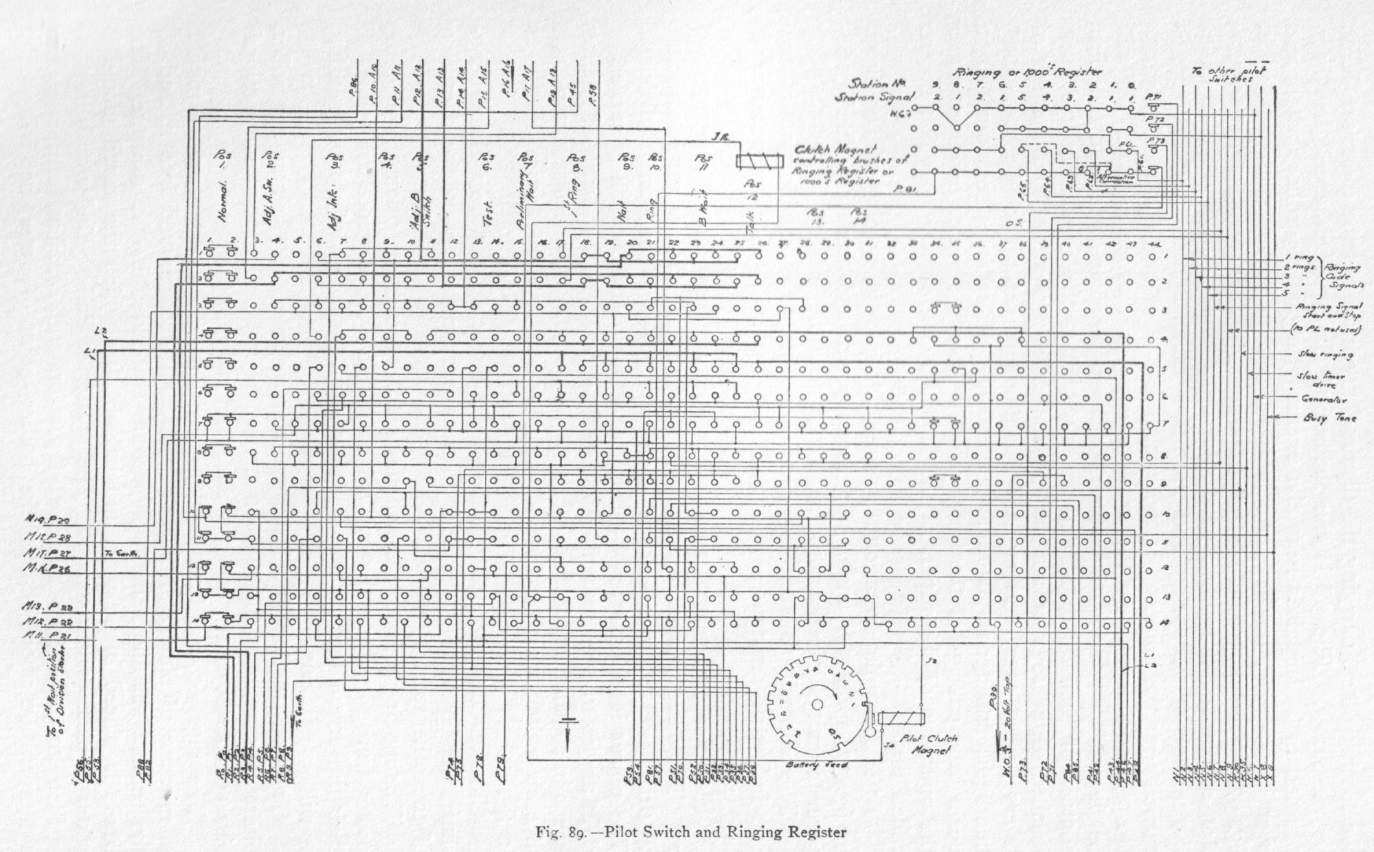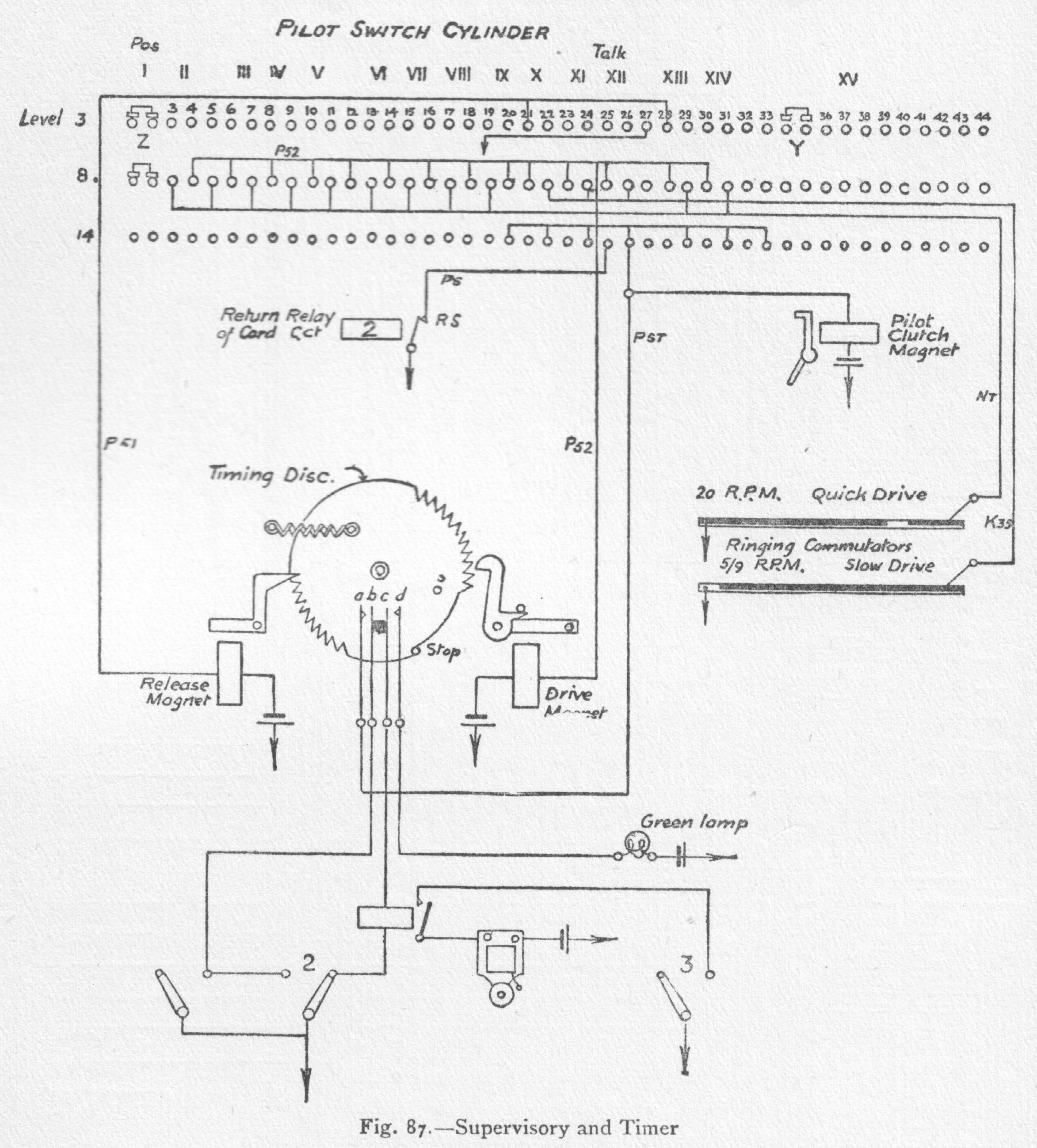 follows:- The subscriber's set is illustrated in figs. 66, 67, 68, and 69. Fixed to each lever and moving with it is a curved strip having figures 0 to 9. The levers are in their right position when the required numbers are visible at each window. Fig. 87. - Supervisory and Timer Fig. 97 shows the normal position of apparatus ready to receive a call. The levers as shown are set with their earthed springs on contact-pins 1, 7, 4, and 6 respectively. When the crank handle is turned the brush arm is mechanically shifted, so that its brush rests upon contact E. The arm c is lifted out of the notch and rides on the ridge of the disc, consequently the arm extension d presses spring a into contact with b. The turning of the crank handle also winds up a spring which tends to rotate the toothed wheel carrying the disc and brush arm in the direction shown by the arrow. Fig. 98 is the theoretical circuit when a call has been "turned in". Impulses from the exchange signal controller switch pass over line 2 via b and a through the signal or stepping magnet, as in fig. 97. The movement of the armature and the corresponding operation of the double-toothed pawl allows the toothed disc to rotate under the tension of the spring, and the brush which is connected to line 1 is carried over the points. At the exchange end of line i is a relay which is operated immediately the brush touches an earthed contact. As will be shown later, during the interval between the time of touching the first contact of each quadrant and the time when the earthed contacts are reached, three register magnets at the exchange record the number of levers passed over, and register the numbers set up in the thousands, hundreds, and tens quadrants respectively. The impulses over line 2 during the passage of the brush over the fourth or units quadrant cause the operation of the wipers of the final switch to move and pick up the called line. Fig. 88. - A or Line-finder Switch Fig. 89. - Pilot Switch and Ringing Register