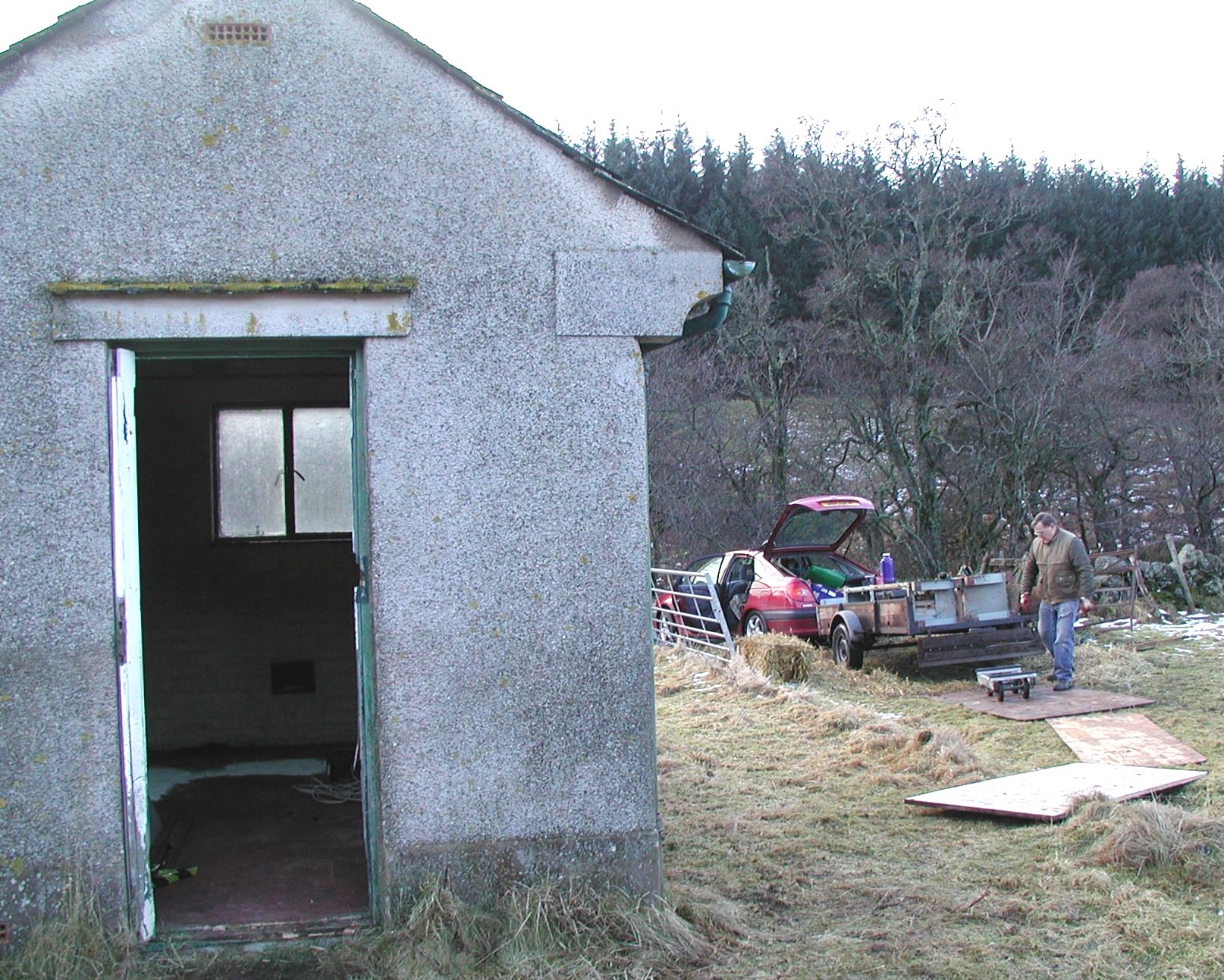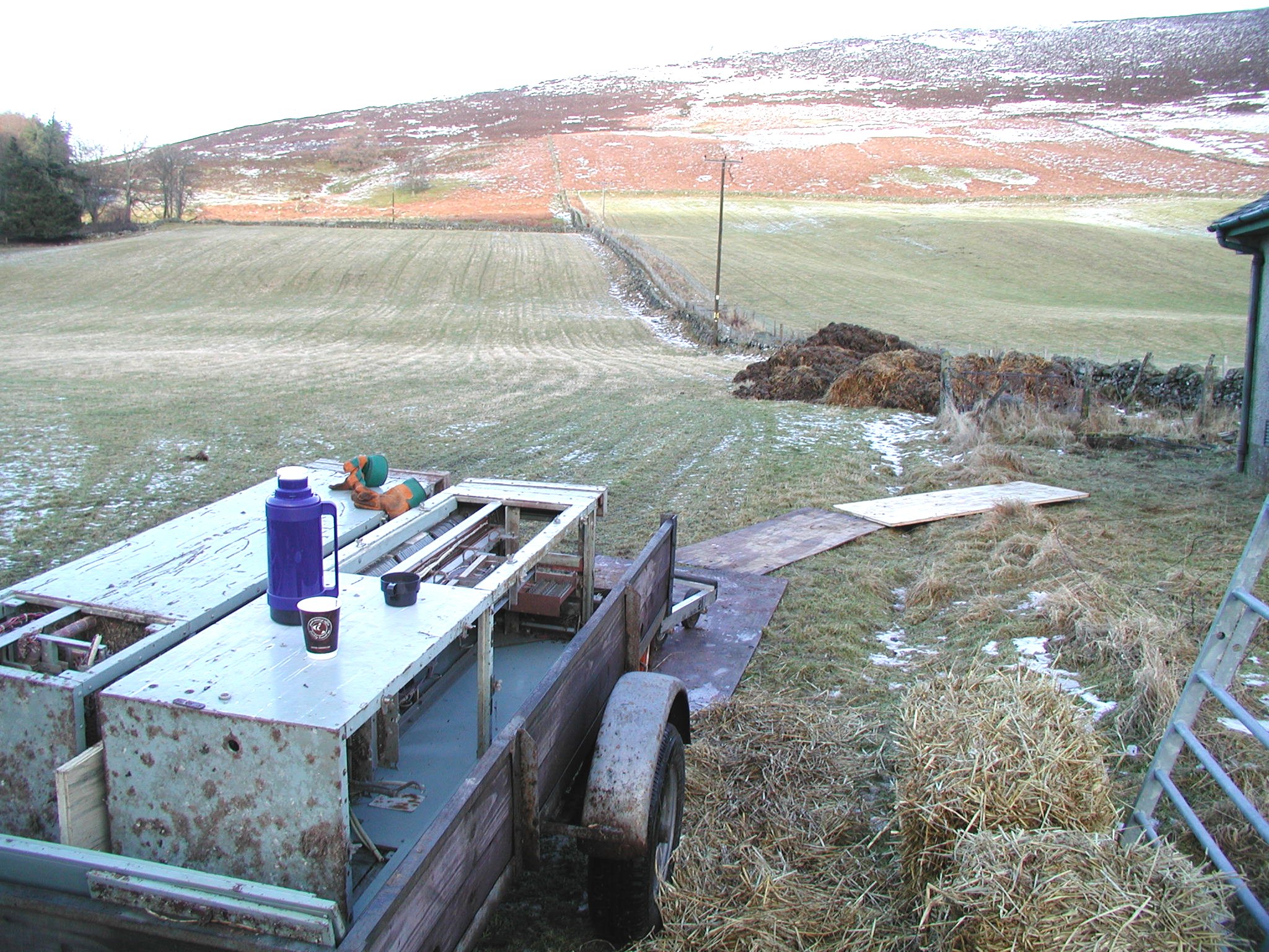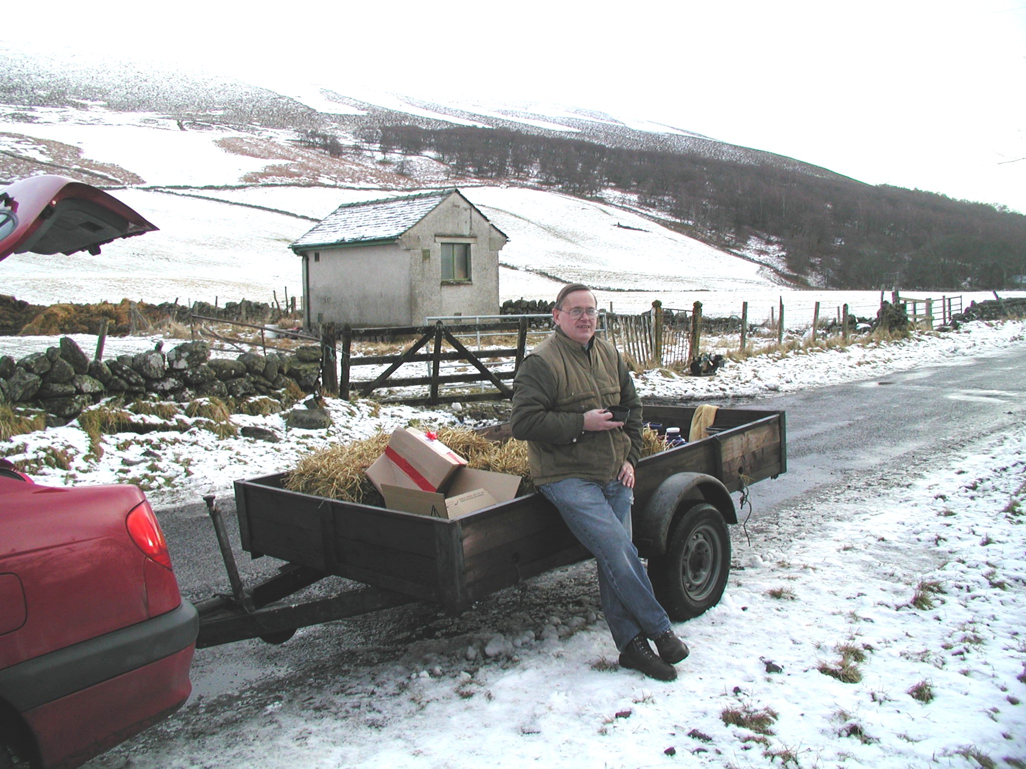 After our planned lunch in "Kerry" we drove back up to Glen Prosen to complete the intended job in hand. The ground was now thawed and very wet, so David’s idea to spread straw about under foot proved very useful between the exchange and around the trailer. Fortunately, as we were lodging at a farm, we were able to obtain the bales locally without charge. They seem to grow millions of tons of the stuff in this part of Scotland. Its essential to the Whiskey you know. The boards I brought also were essential underfoot to allow the racks to be effortlessly wheeled out of the building and into the trailer, using my 4 wheel bogie. This is the best tool I ever found for moving big objects almost single handed. By the time dark was falling just about everything was loaded and the remaining job was to fasten the tarpaulin sufficiently well to keep it down when travelling at speed on the motorway. At this point, when we no longer needed any help with any lifting, the first and only contact with the locals occurred! The lairds handyman came by to check all was ok!