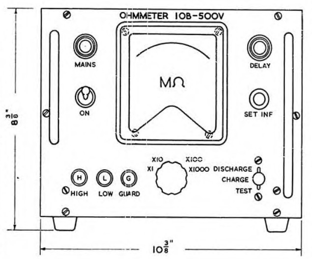 This is an Ohmmeter used for insulation testing, operating at 500 volts. Range:- 0.3 - 10,000M ohms. Input:- 200-250 volts AC at 50c/s. Drawing - CD1720. Specification - D2065.